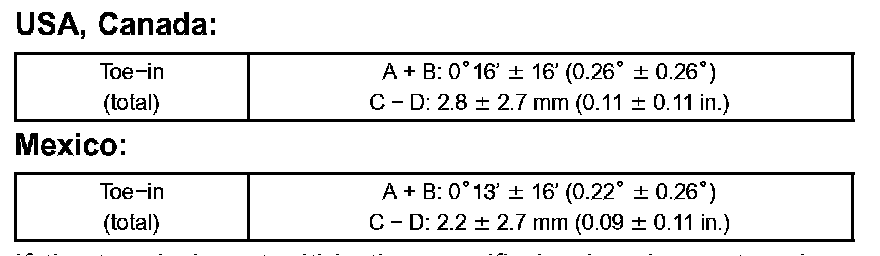 If the toe-in is not within the specified value, inspect and replace the suspension parts as necessary.