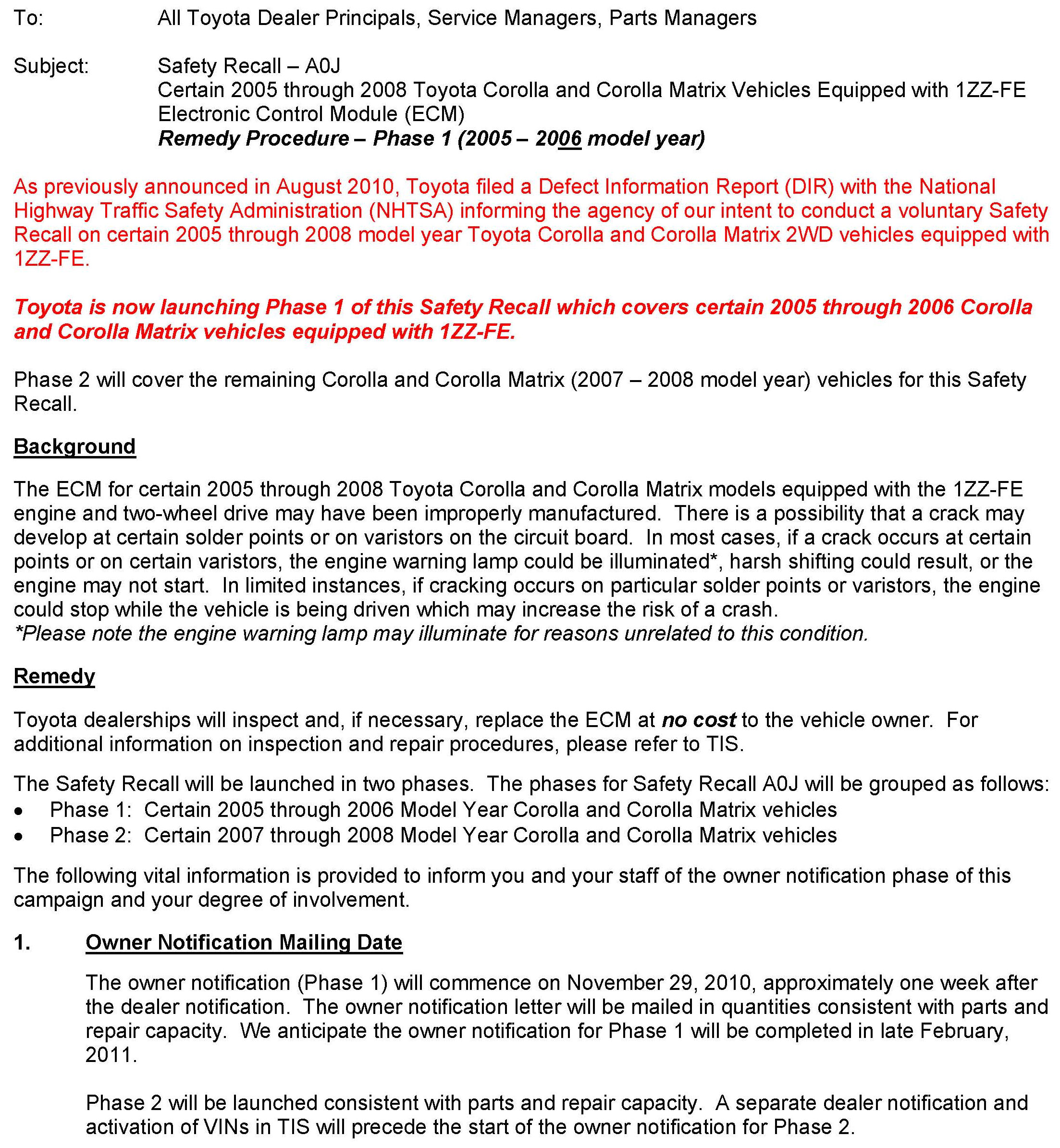 Recall - ECM Replacement For Stalling Condition