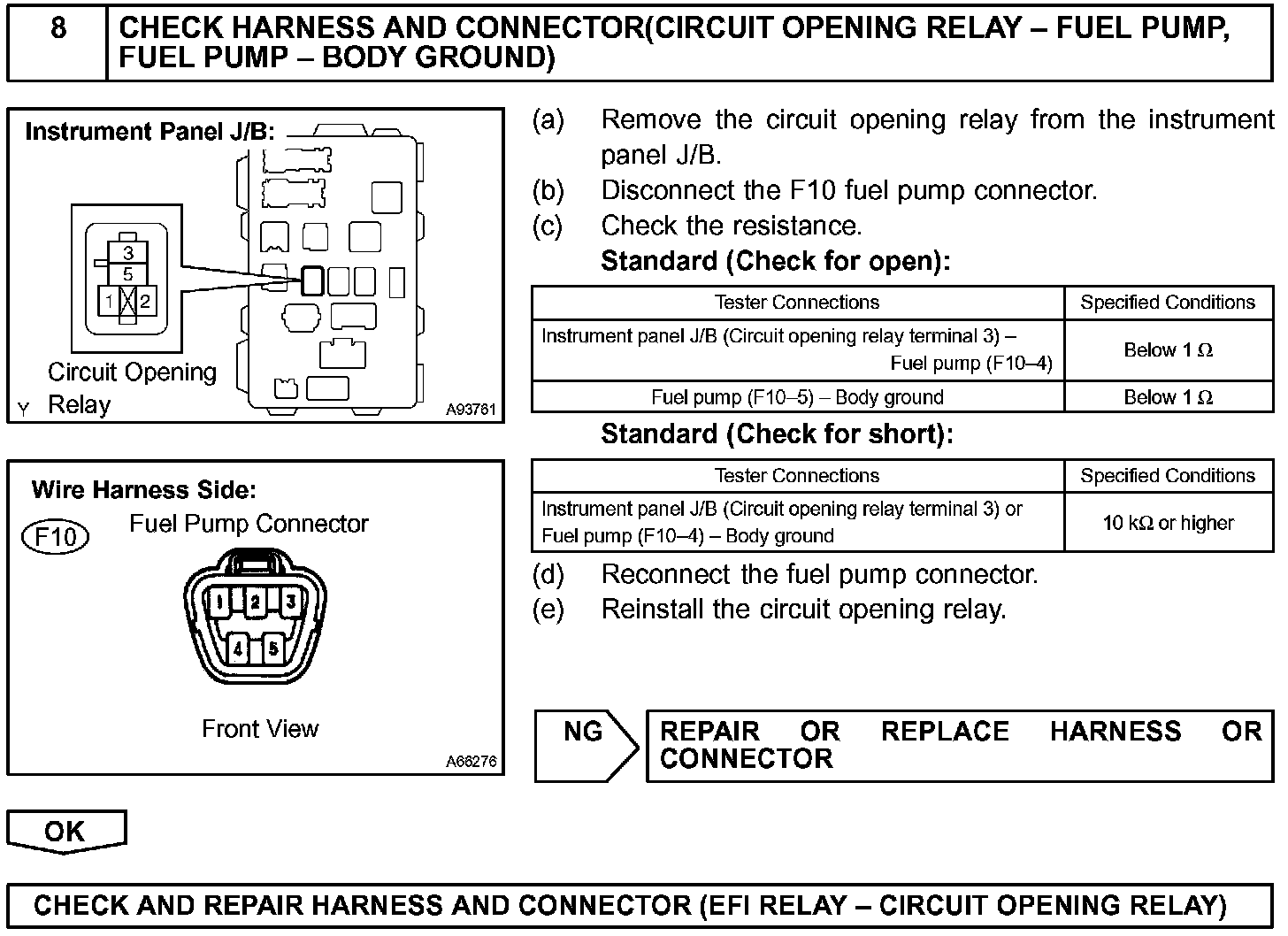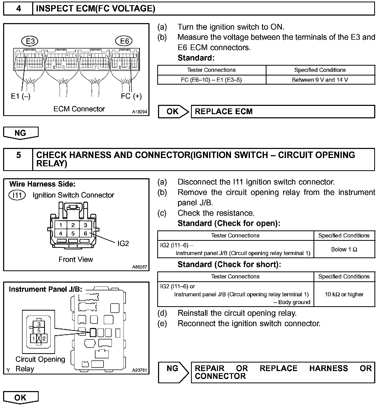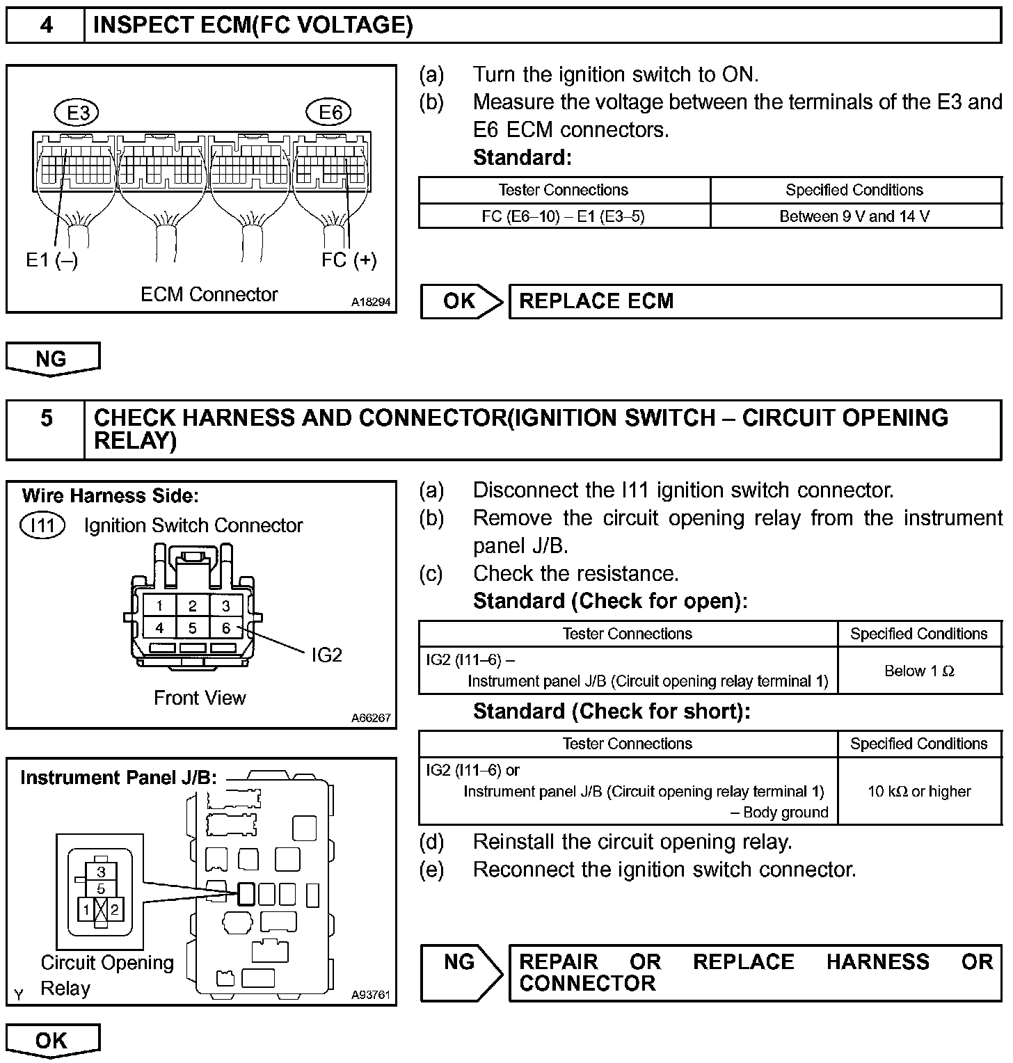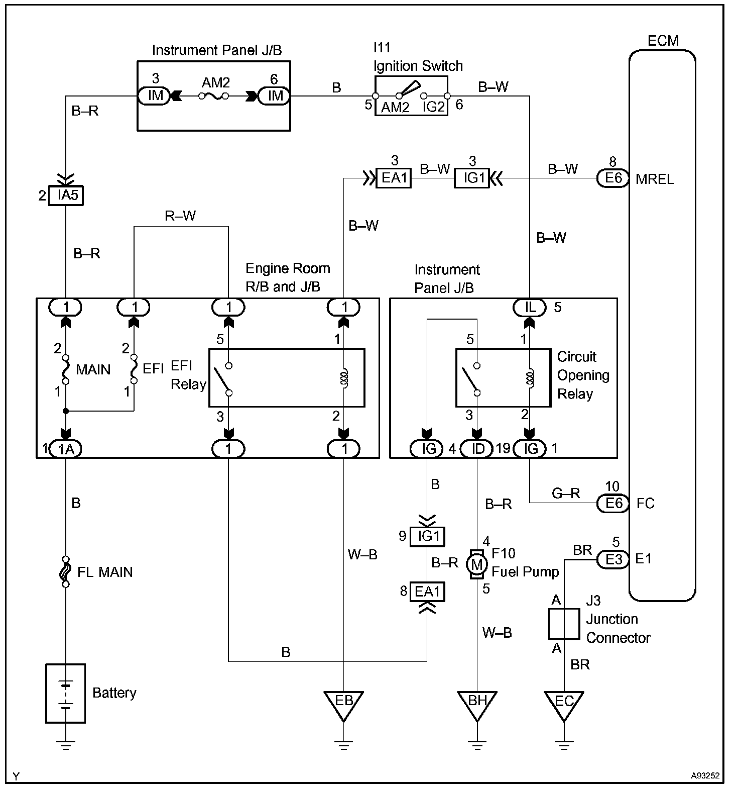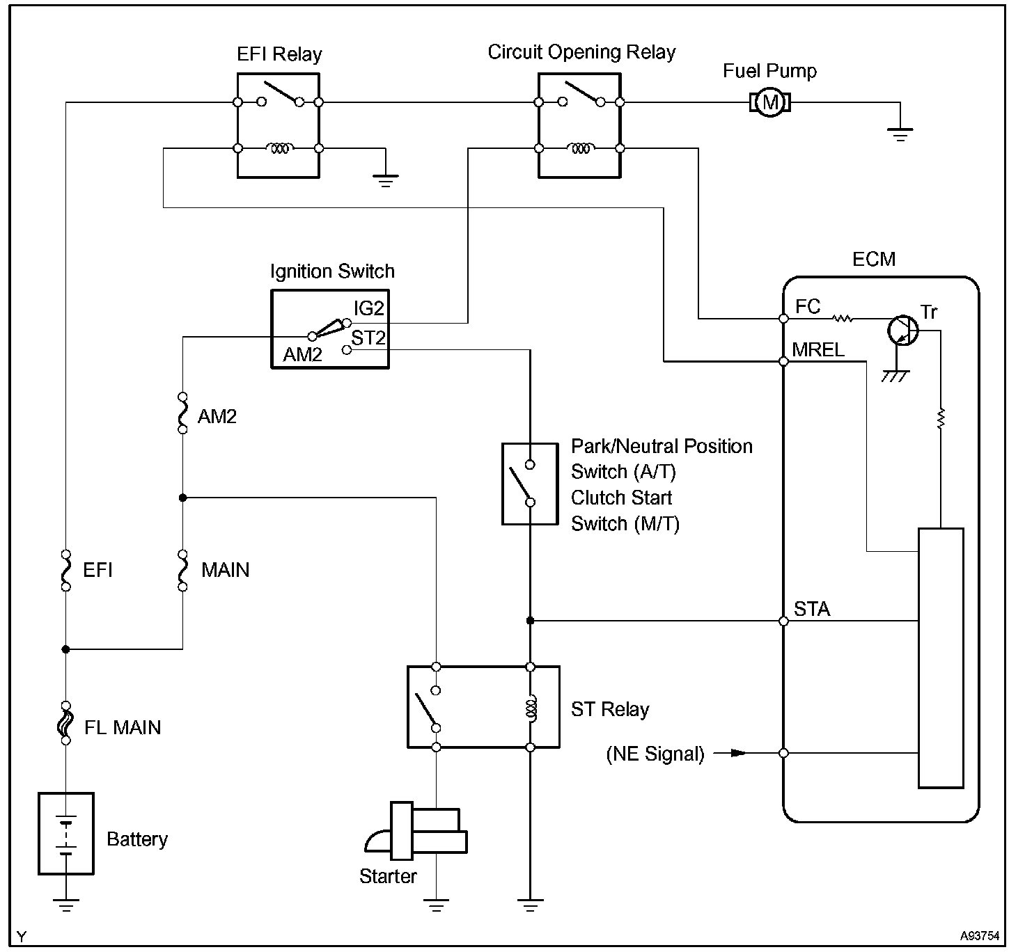 When the STA and NE signals are received by the ECM, Tr (power transistor) is switched on, allowing a current to flow into the circuit opening relay coil. The circuit opening relay switches on, power is supplied to the fuel pump and the fuel pump operates.