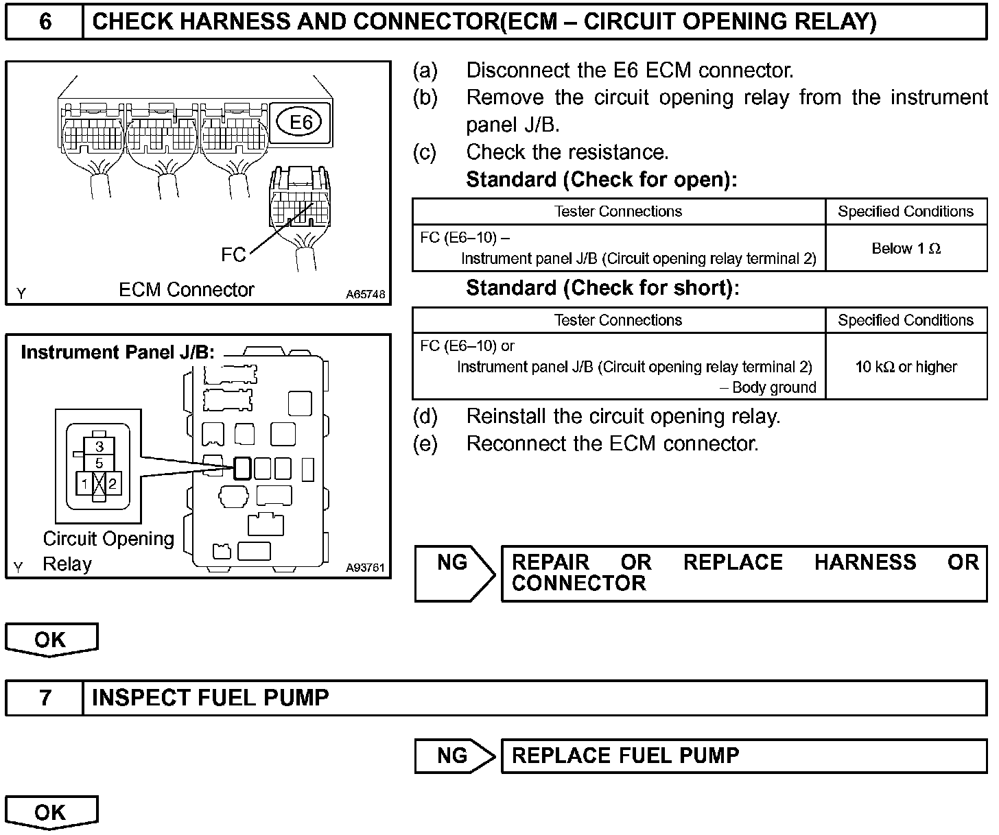 While the NE signal is being generated (engine running), the ECM keeps Tr ON, therefore keeping the circuit opening relay ON, so that the fuel pump continues to operate.