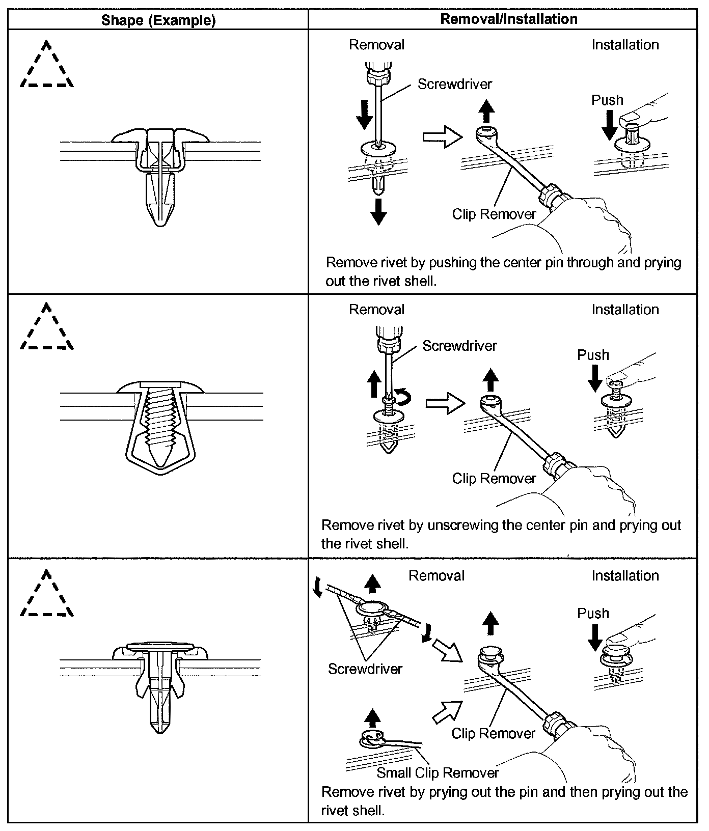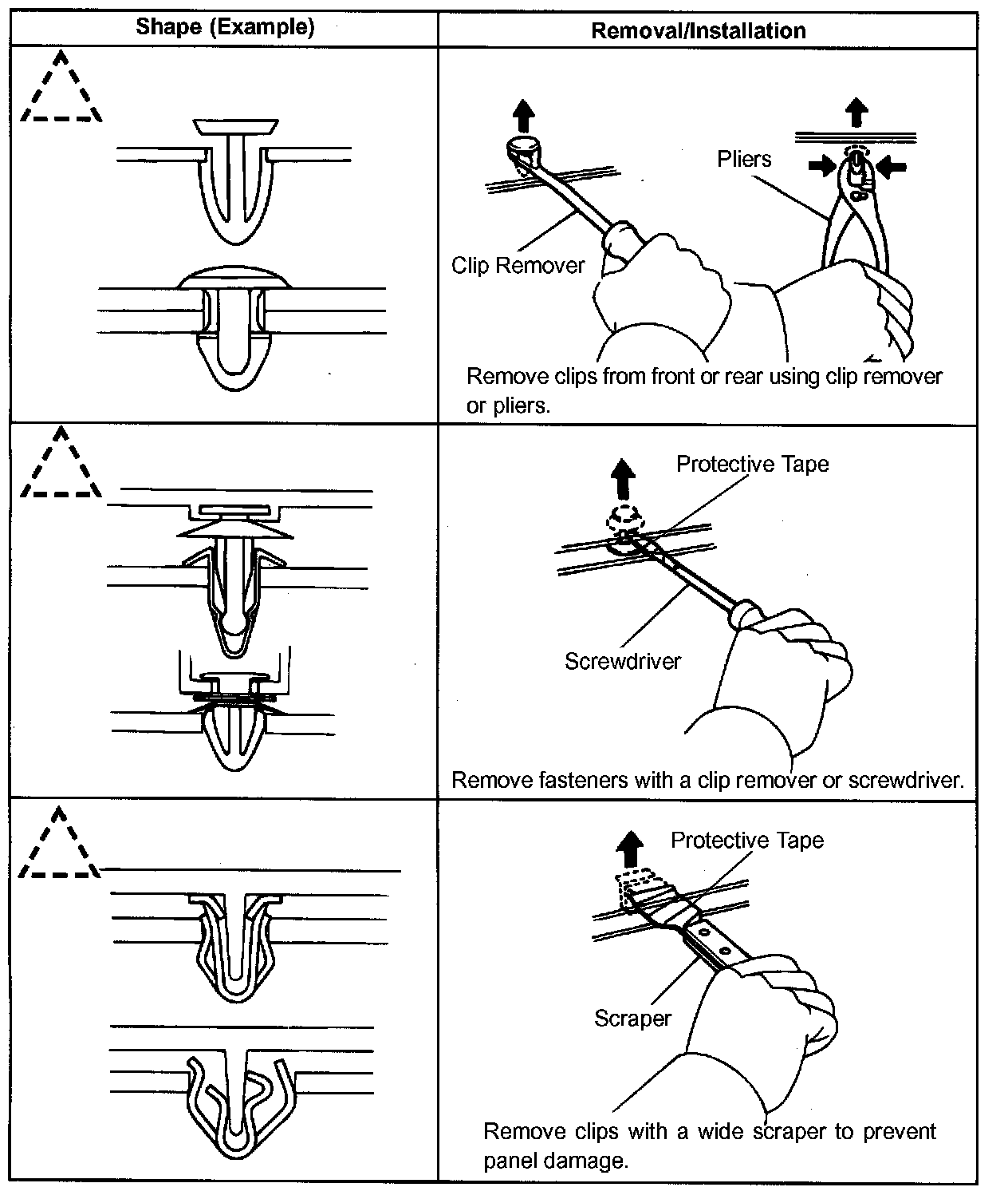1 The removal and installation methods of typical clips used in body parts are shown in the table.