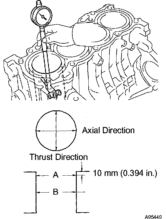 Using a cylinder gauge, measure the cylinder bore diameter at positions A and B in the thrust and axial directions.