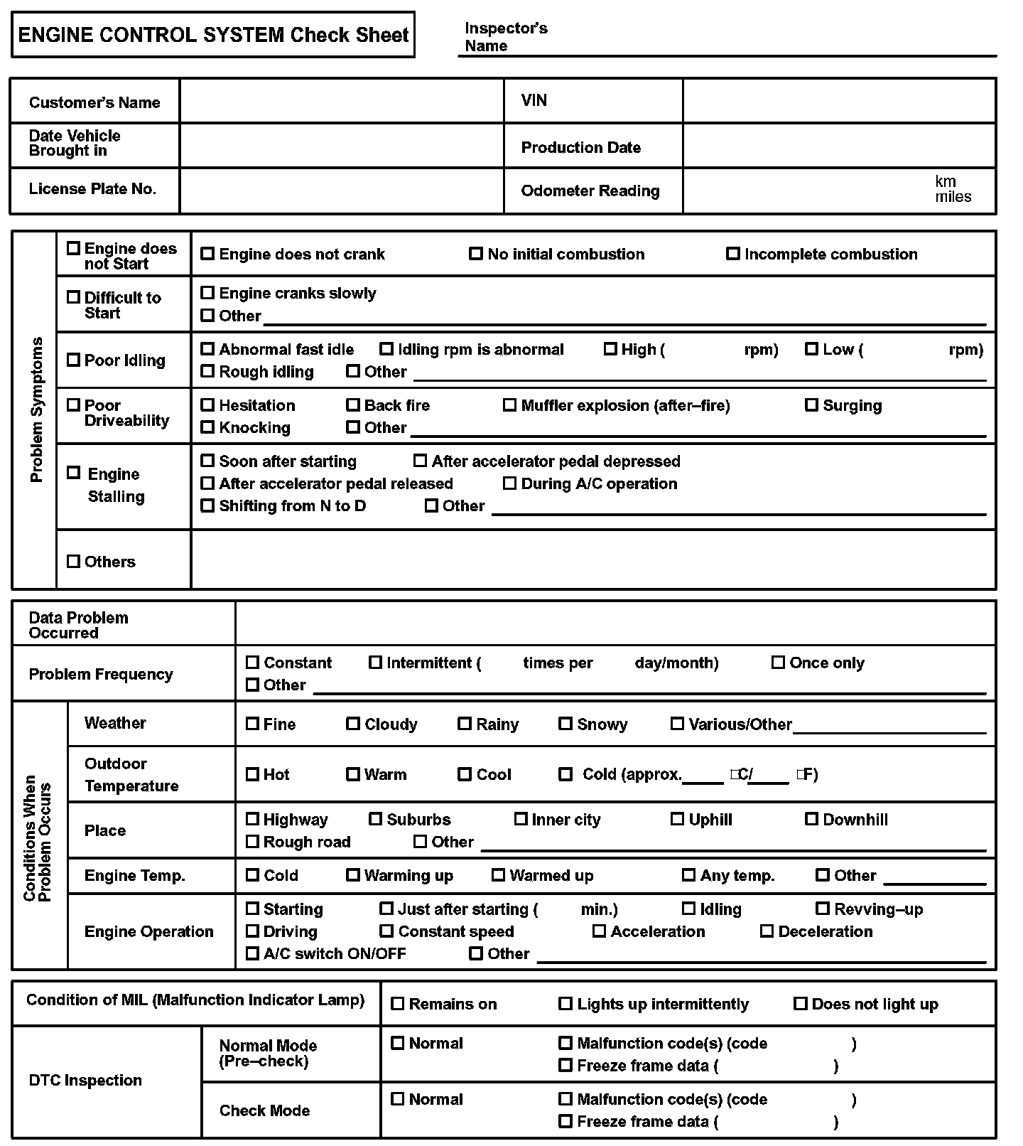 Engine Control System Check Sheet: