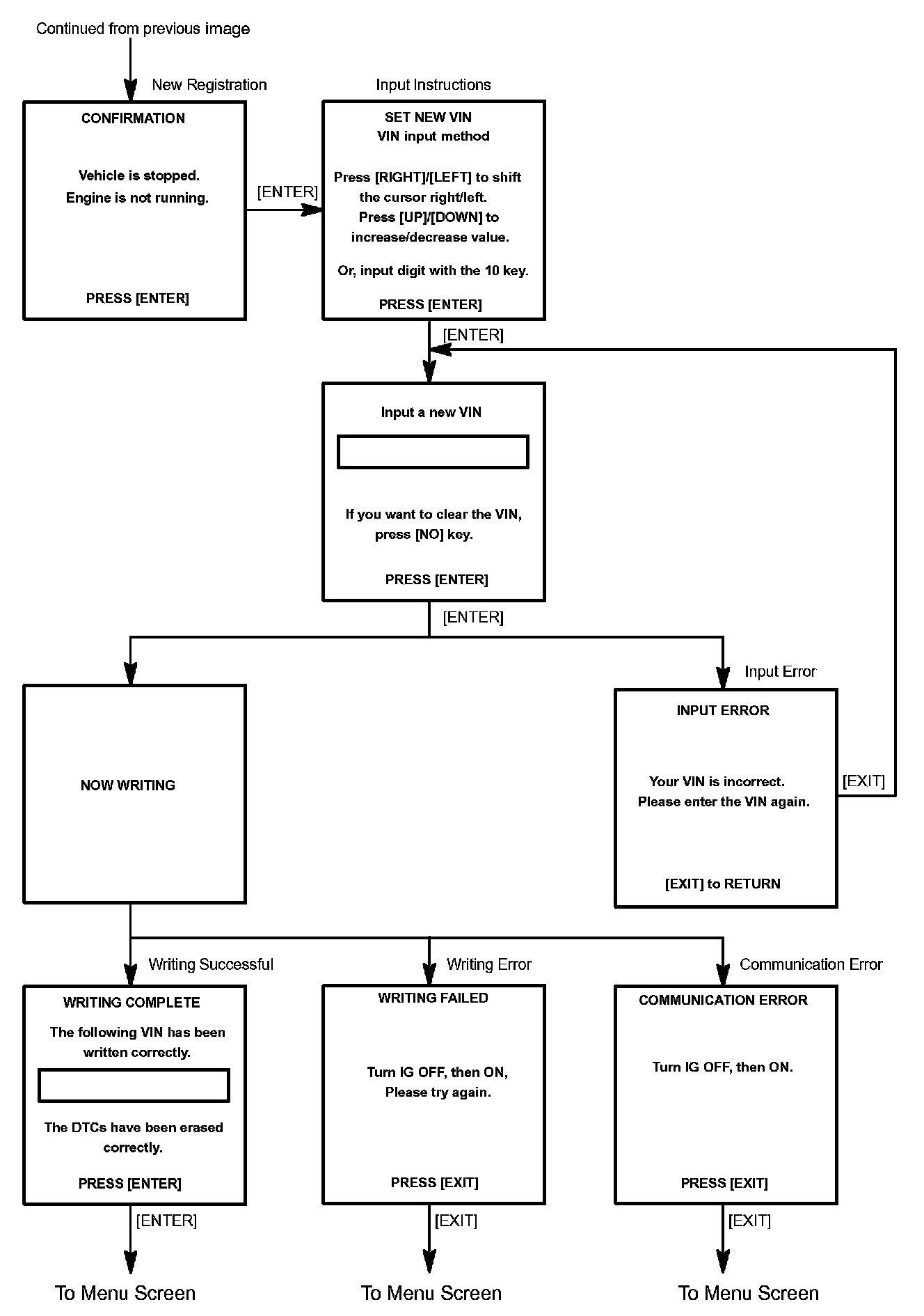 c. Write VIN: Explains the VIN writing process in a flowchart. This process allows the VIN to be input into the ECM. If the ECM is changed, or the VIN and VIN do not match, the VIN can be registered, or overwritten in the ECM by following this procedure.