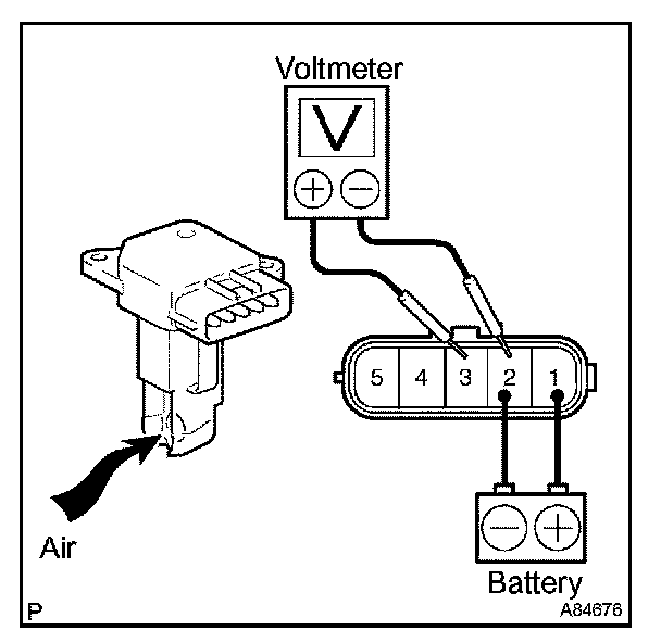3. Blow air into the mass air flow meter, then check that the voltage fluctuates. If the voltage does not fluctuate, replace the mass air flow meter.