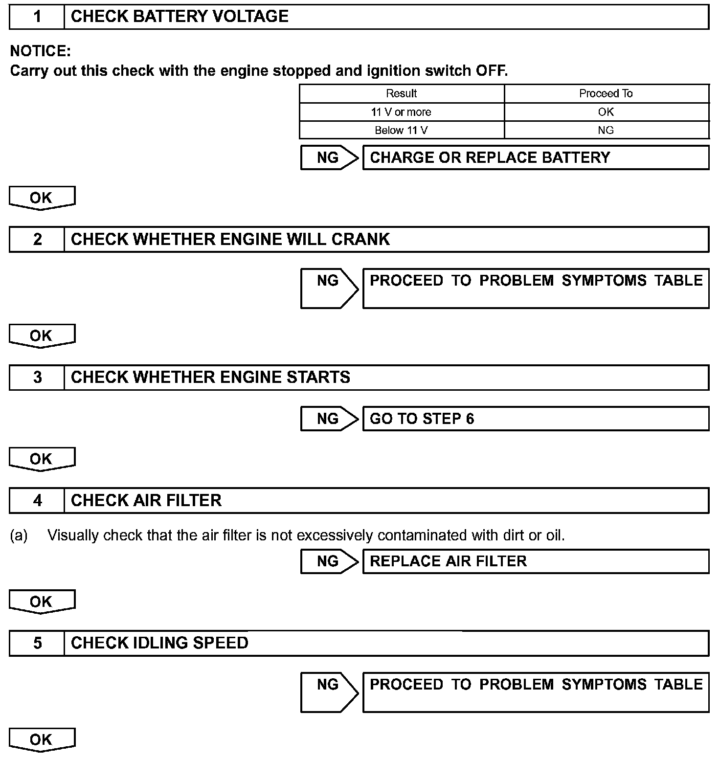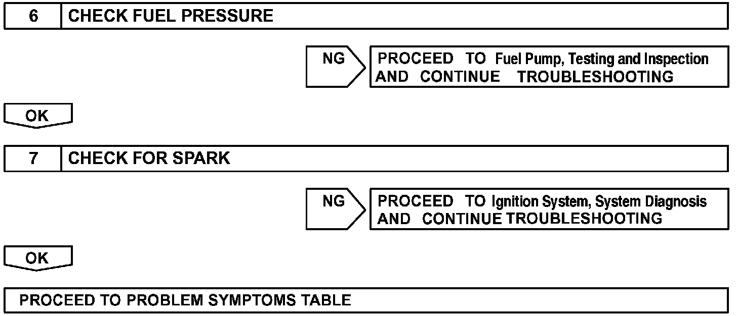 When a malfunction is not confirmed by the DTC check, troubleshooting should be carried out in all circuits considered to be possible causes of the problem. In many cases, by carrying out the basic engine check shown in the flowchart, the location of the problem can be found quickly and efficiently. Therefore, using this check is essential when engine troubleshooting.