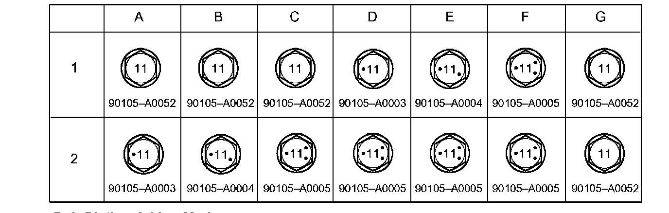 Check installed bolts combination. Select appropriate bolts from the table below to adjust the camber to within the specified range.