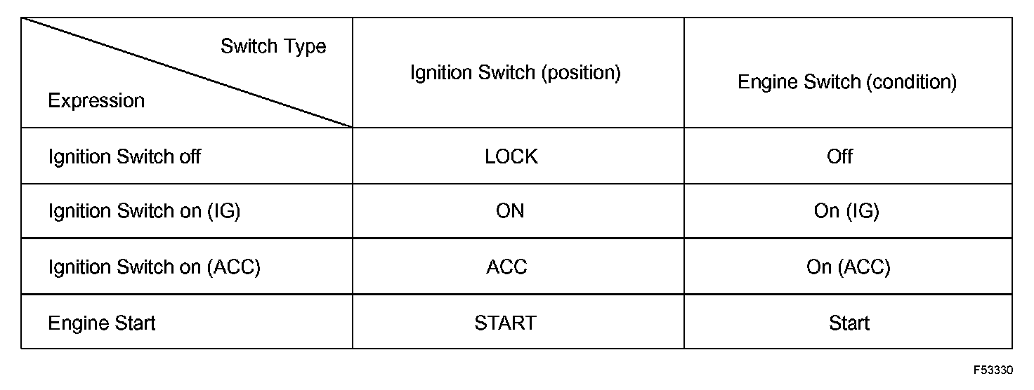 The type of ignition switch used on this model differs according to the specifications of the vehicle. The expressions listed in the table are used in this section.
