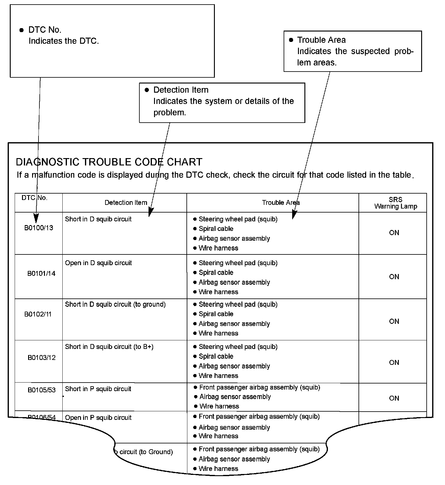 DIAGNOSTIC TROUBLE CODE CHARTUse Diagnostic Trouble Codes (DTCs) (from the DTC checks) in the table to determine the trouble area and proper inspection procedure. The Supplemental Restraint System (SRS) DTC chart is shown as an example.