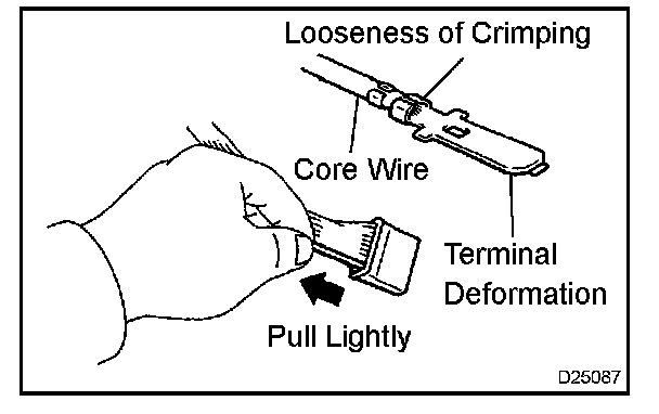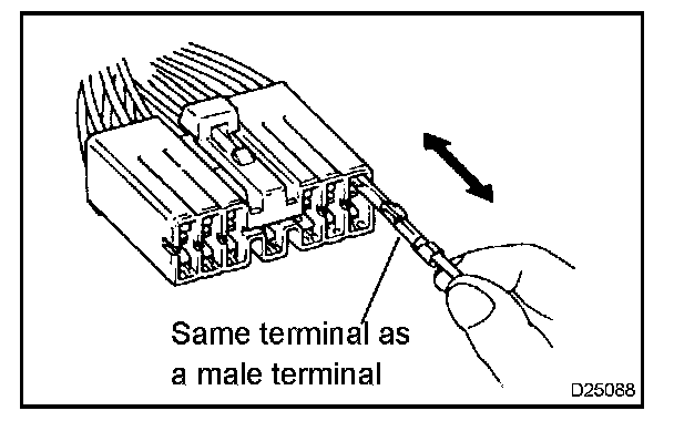 Prepare a spare male terminal. Insert it into a female terminal, and check for ample tension when inserting and after full engagement.