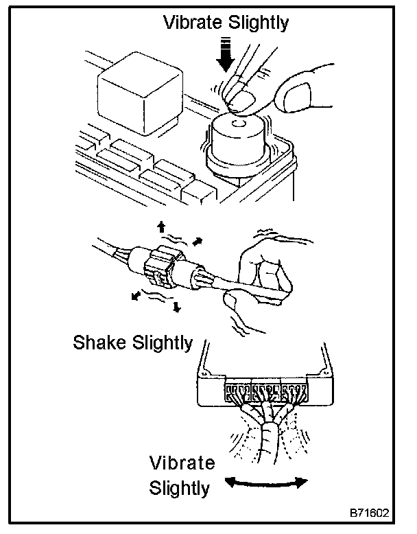 Vibration, heat or water penetration (moisture) is difficult to reproduce. The symptom simulation tests below are effective substitutes for the conditions and can be applied on a stationary vehicle. Important points in the symptom simulation test: