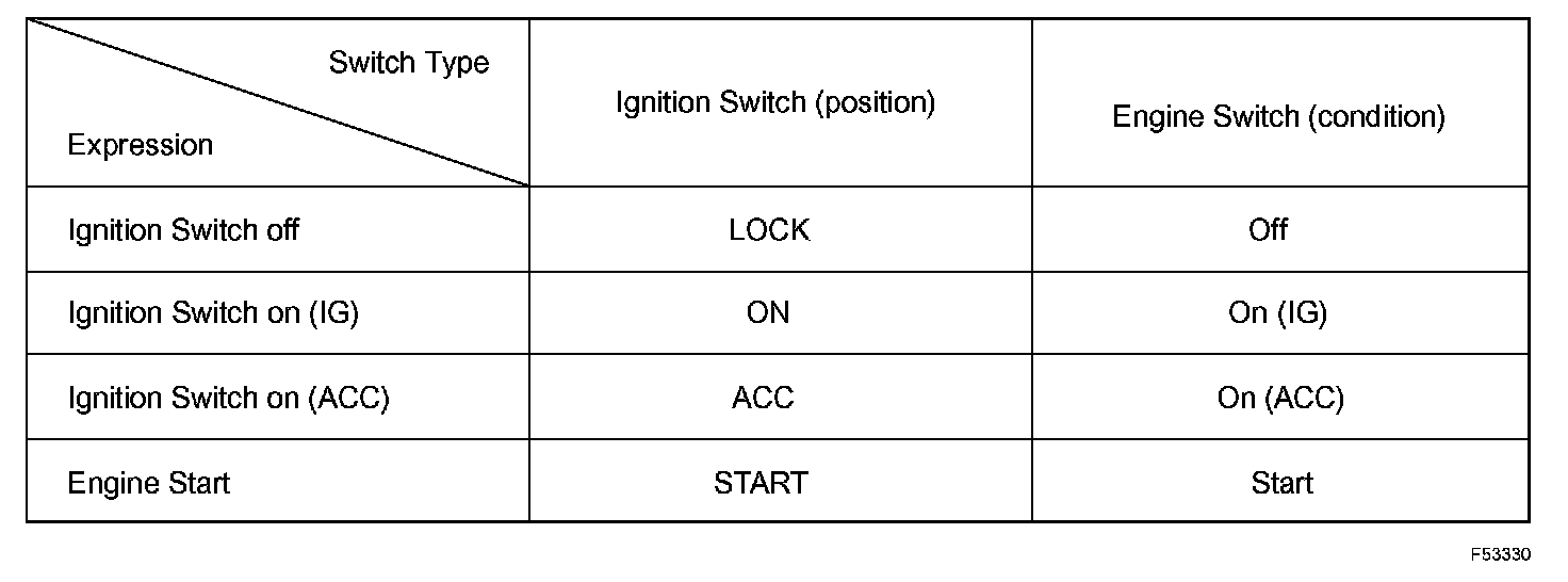 The type of ignition switch used on this model differs according to the specifications of the vehicle. The expressions listed in the table are used in this section.