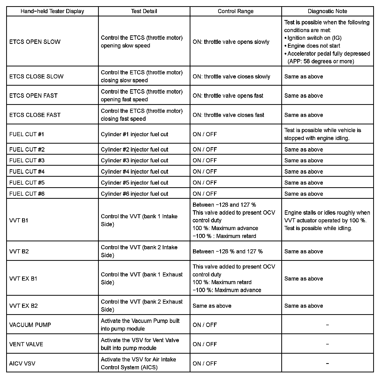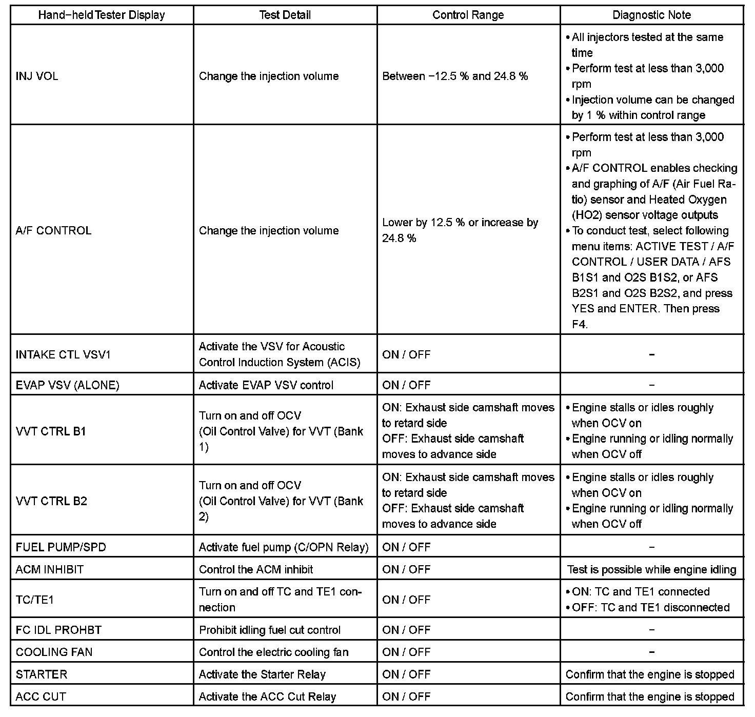 ACTIVE TESTHINT: Performing an ACTIVE TEST enables components including the relays, VSV (Vacuum Switching Valve), and actuators, to be operated without removing any parts. The ACTIVE TEST can be performed with a hand-held tester. Performing an ACTIVE TEST as the first step of troubleshooting is one method to shorten
