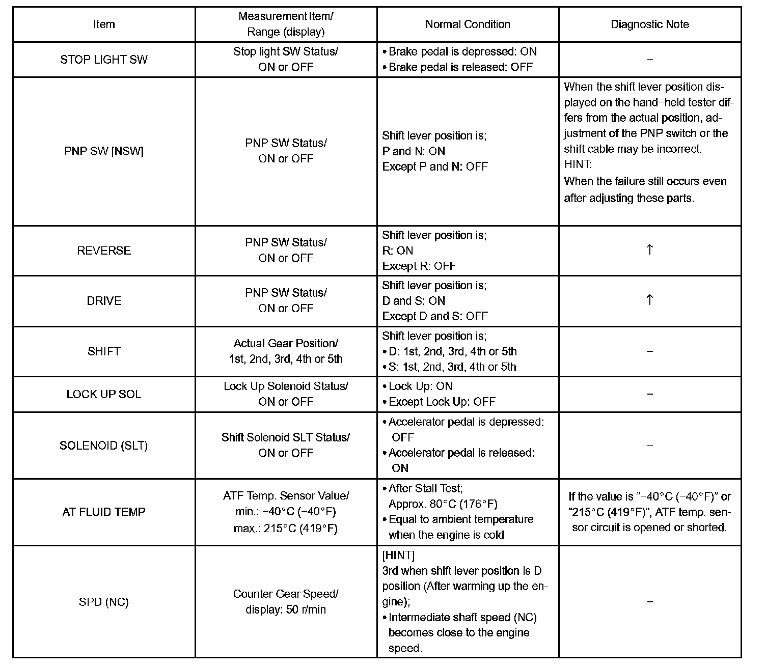 DATA LISTHINT: According to the DATA LIST displayed by the hand-held tester, you can read the value of the switch, sensor, actuator and so on without parts removal. Reading the DATA LIST as the first step of troubleshooting is one method to shorten labor time.