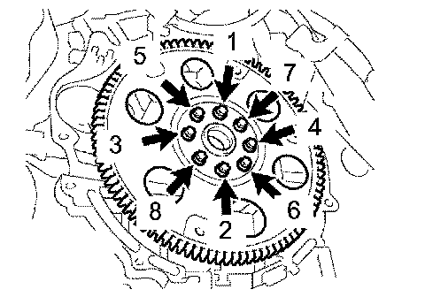 Temporarily tighten the 8 bolts in the order shown in the illustration.