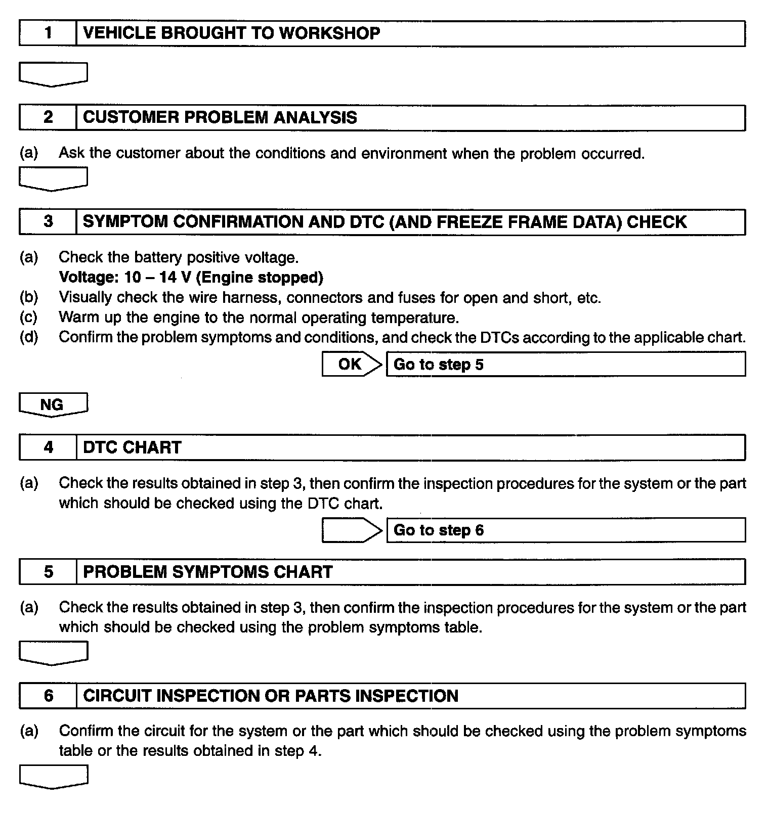 Hint: Carry out a troubleshooting in accordance with the procedures. Here, only the basic procedures are shown. Details are provided in the Diagnostics section, showing the most effective methods for each circuit. Confirm the troubleshooting procedures first for the relevant circuit before beginning the troubleshooting of that circuit.