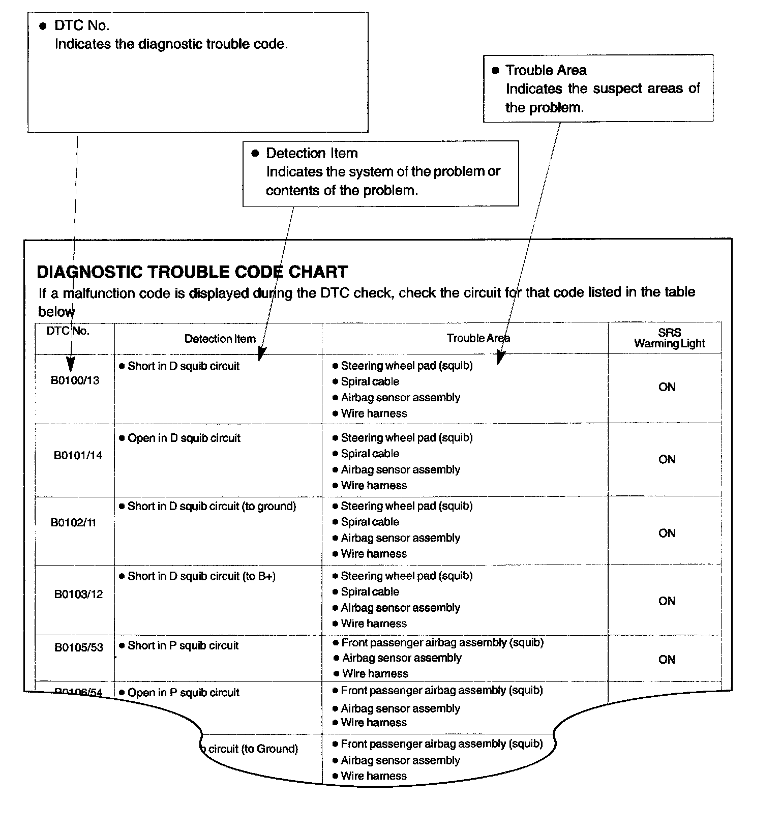 DIAGNOSTIC TROUBLE CODE CHARTThe inspection procedures are shown in the table. This table permits an efficient and accurate troubleshooting using the diagnostic trouble codes displayed in the diagnostic trouble code chart. Proceed with troubleshooting in accordance with the inspection procedures given in the diagnostic chart corresponding to the diagnostic trouble codes displayed. The Supplemental Restraint System diagnostic trouble code chart is shown as an example.