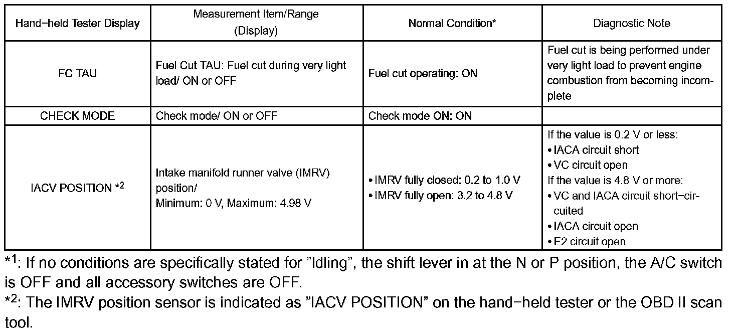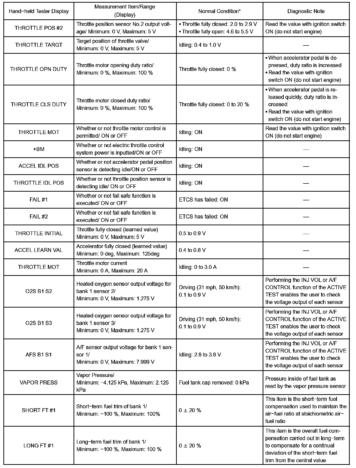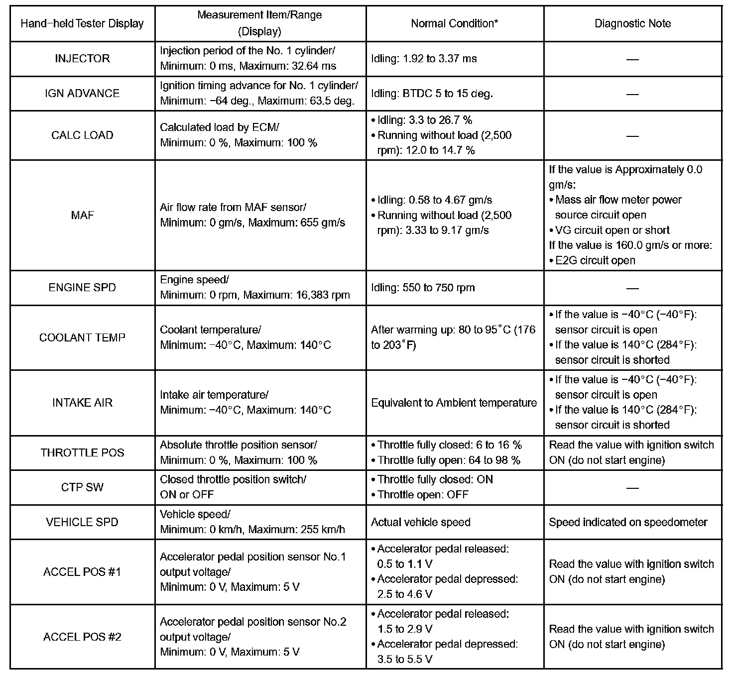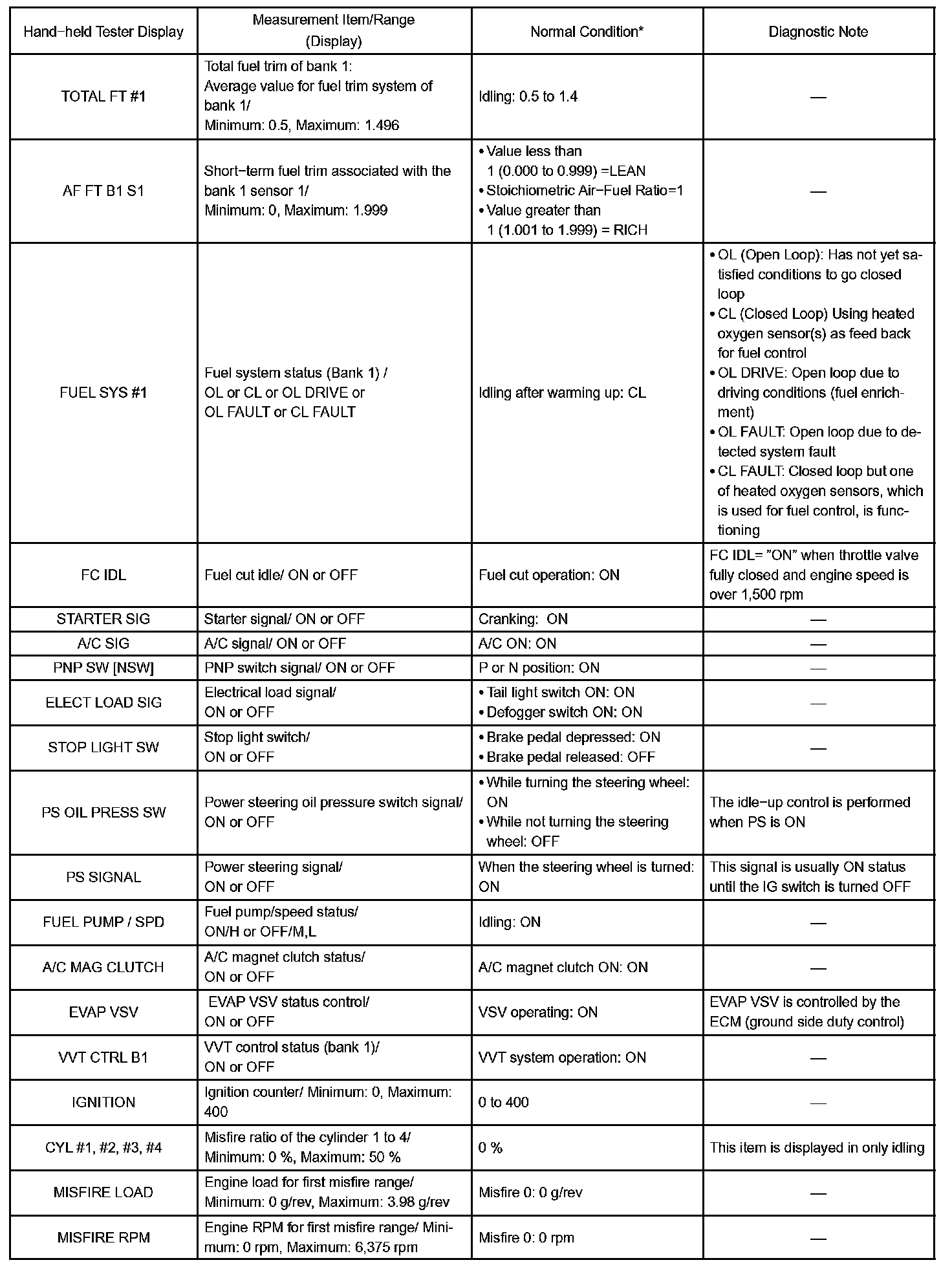 DATA LISTHINT: Using the hand-held tester DATA LIST allows switch, sensor, actuator and other item values to be read without removing any parts. Reading the DATA LIST early in troubleshooting is one way to shorten labor time.