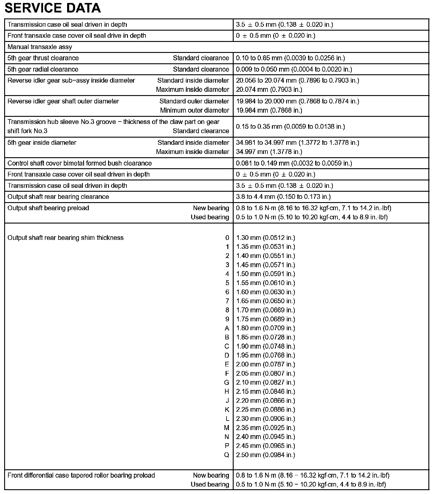 Manual Transmission / Transaxle-Service Data (Part 1):