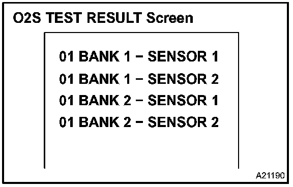 b. On the tester screen, select the following menus: DIAGNOSIS/ CARB OBD II/O2S TEST RESULT. A list of the O2S equipped on the vehicle will be displayed.