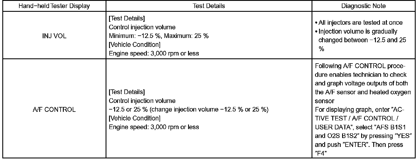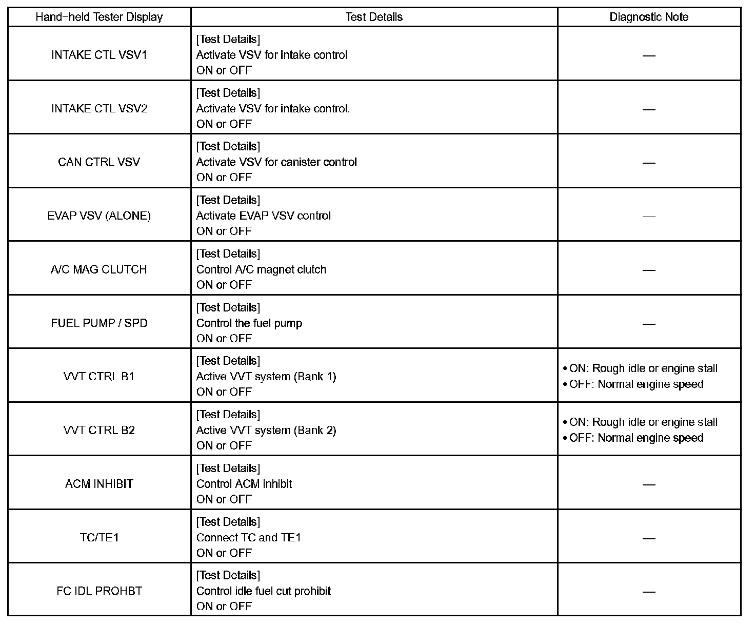 HINT: Performing the hand-held tester ACTIVE TEST allows relay, VSV, actuator and other items to be operated without removing any parts. Performing the ACTIVE TEST early in troubleshooting is one way to shorten labor time. The DATA LIST can be displayed during the ACTIVE TEST.