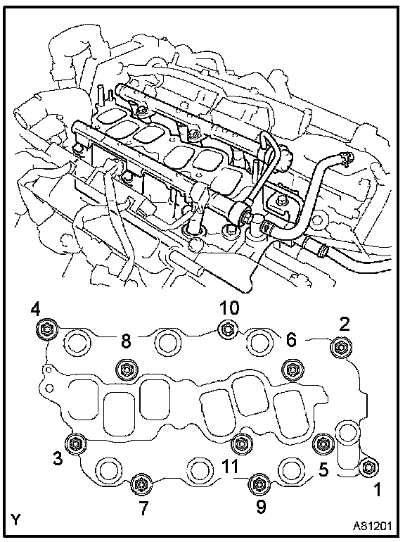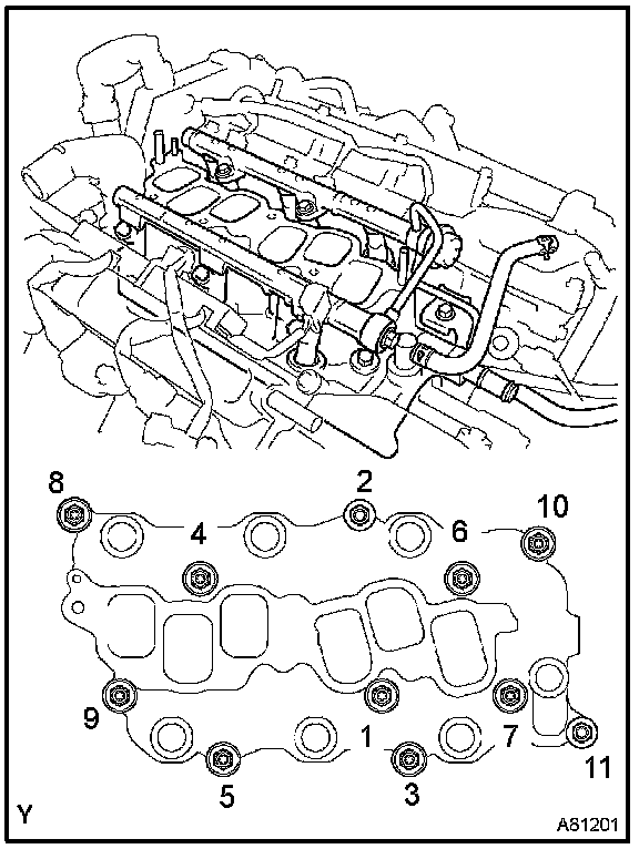 NOTE: In this case, fully tightening one of these bolts or nuts without partially tightening the other bolts or nuts in the group may damage the intake manifold, bolts and nuts.