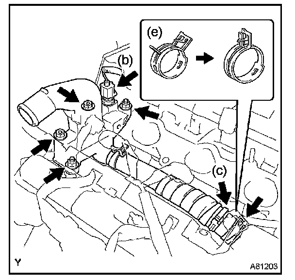 e. Lock the hose clamp as shown in the illustration. Then remove the water outlet together with the water bypass hose No. 1.