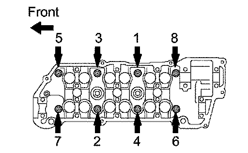 c. Uniformly install and tighten the 8 cylinder head bolts in the sequence shown in the illustration.