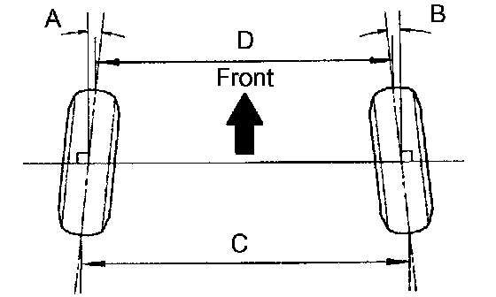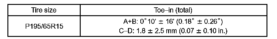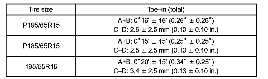 - If toe-in is not within the specified range, inspect the suspension parts for damage and/or wear, and replace them if necessary.