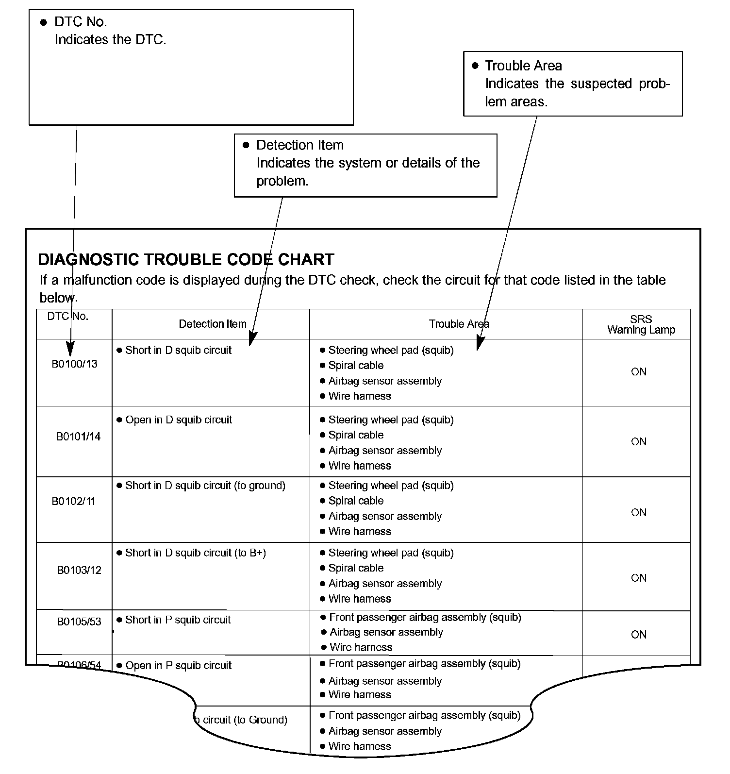 DIAGNOSTIC TROUBLE CODE CHARTUse Diagnostic Trouble Codes (DTCs) (from the DTC checks) in the table to determine the trouble area and proper inspection procedure. The Supplemental Restraint System (SRS) DTC chart is shown as an example.