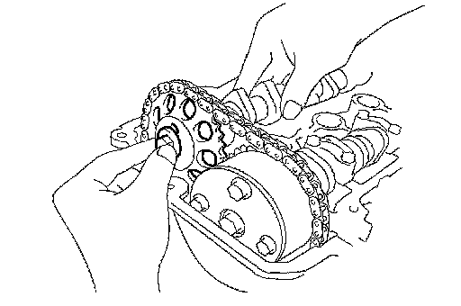 b. Install the timing chain onto the camshaft timing gear with the painted link aligned with the timing mark of the camshaft timing sprocket as shown in the illustration.