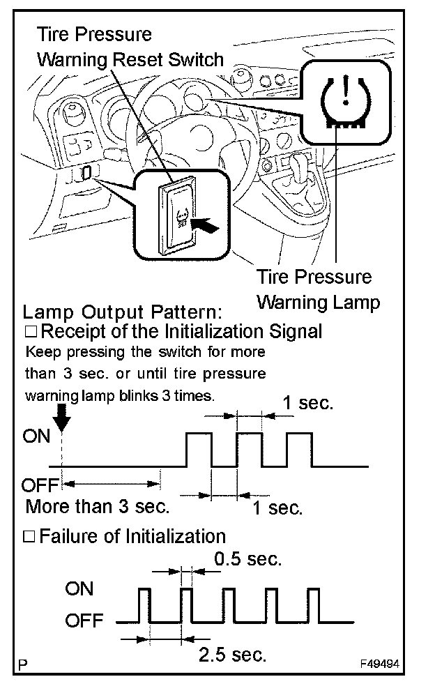 HINT: If the tire pressure warning lamp repeats a cycle of ON (0.5 sec.) and OFF (2.5 sec.) while the vehicle is being driven, initialization may have failed. If so, perform the initialization again. (Turn the ignition switch off and retry from step 1-(a).)