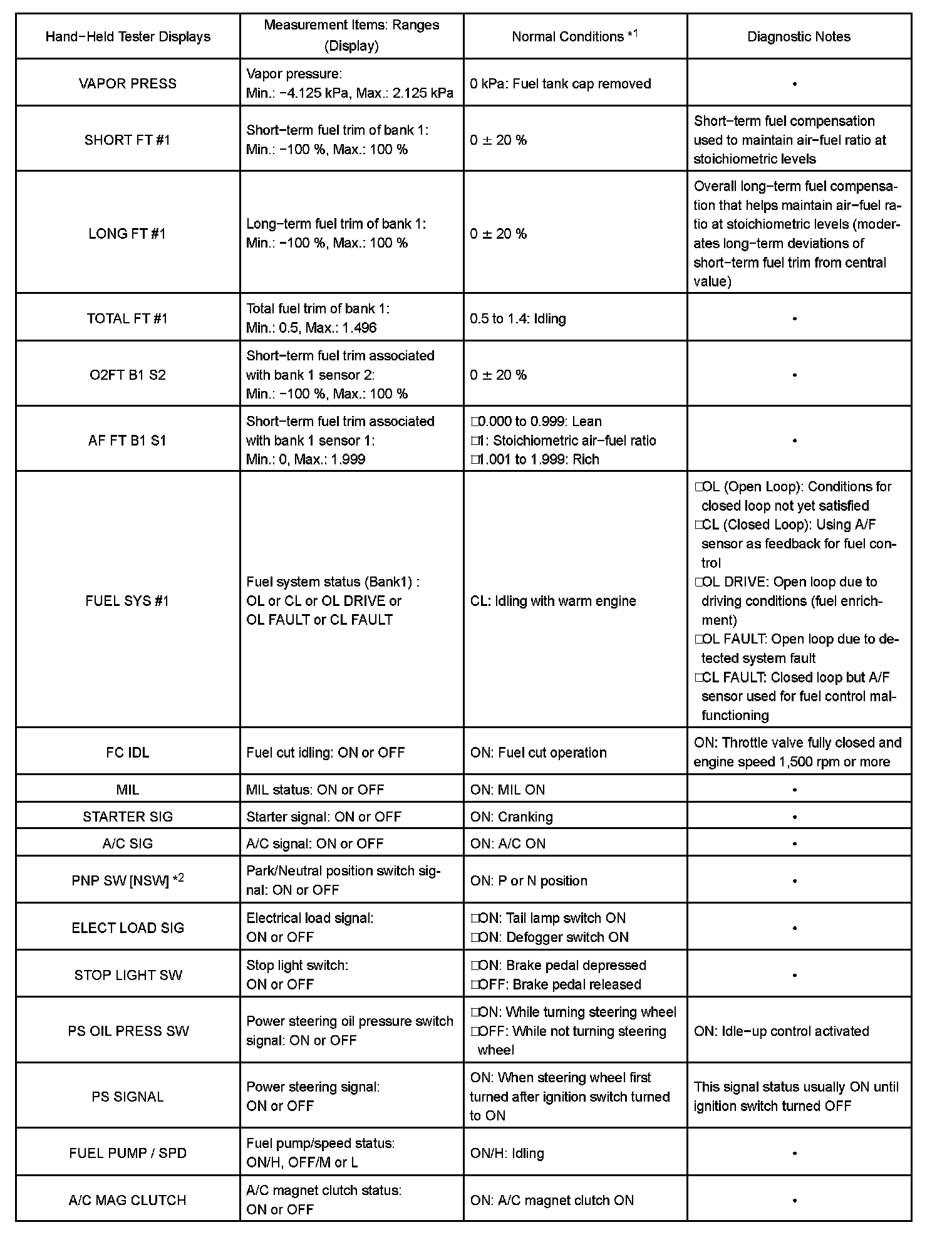 DATA LISTHINT: By reading the DATA LIST displayed on a hand-held tester or OBD II scan tool, you can check values, including those of the switches, sensors, and actuators, without removing any parts. Reading the DATA LIST as the first step of troubleshooting is one method of shortening diagnostic time.