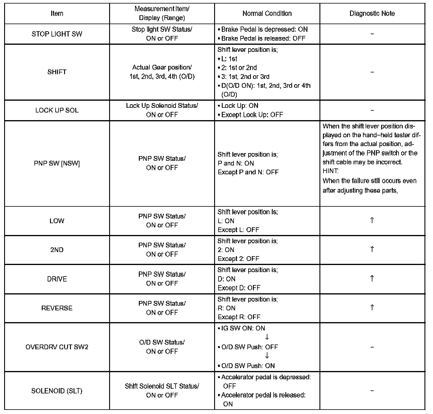 HINT: According to the DATA LIST displayed by the OBD II scan tool or hand-held tester, you can read the value of the switch, sensor, actuator and so on without parts removal. Reading the DATA LIST as the first step of troubleshooting is one method to shorten labor time.