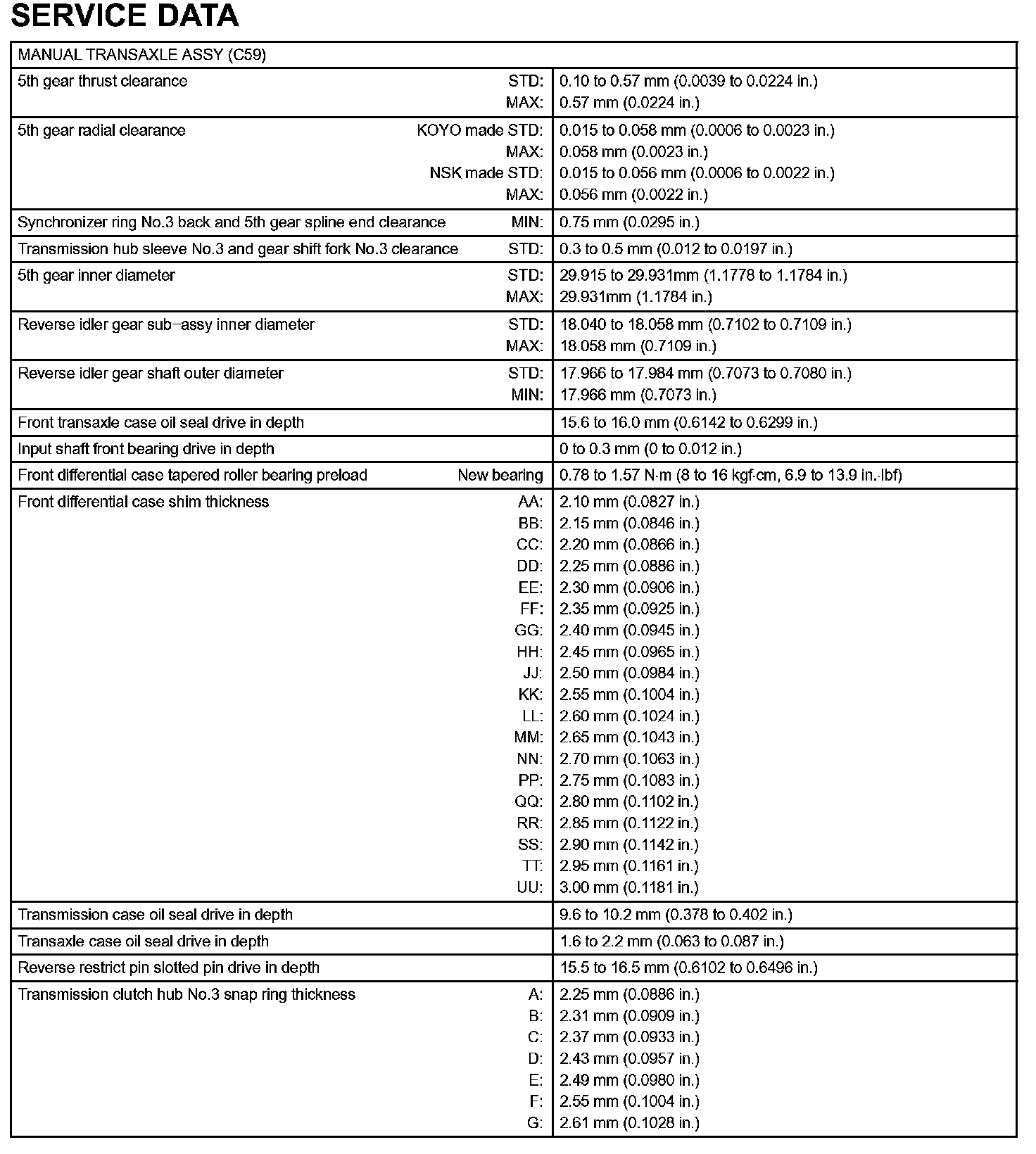 Manual Transmission / Transaxle-Service Data (Part 2):