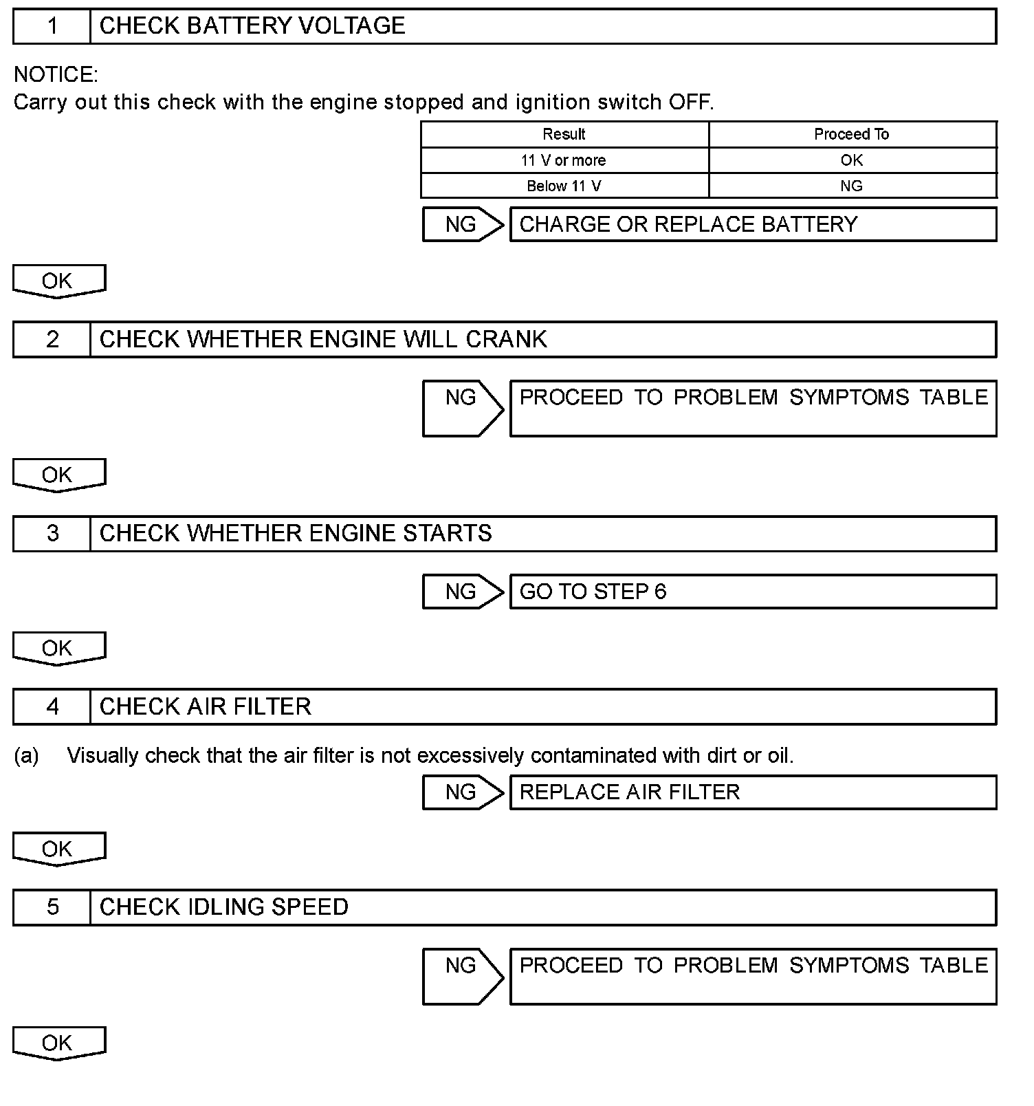 When a malfunction is not confirmed by the DTC check, troubleshooting should be carried out in all circuits considered to be possible causes of the problem. In many cases, by carrying out the basic engine check shown in the given flowchart, the location of the problem can be found quickly and efficiently. Therefore, using this check is essential when engine troubleshooting.
