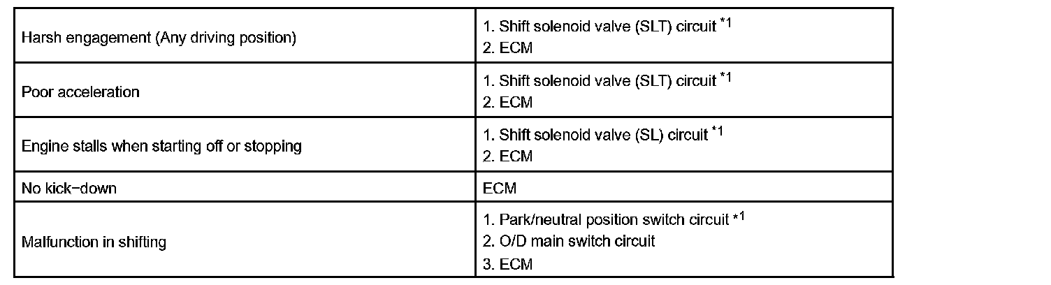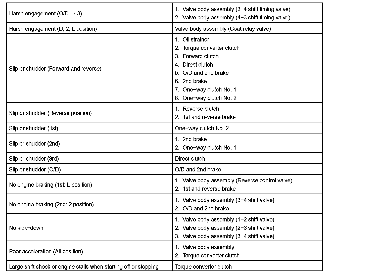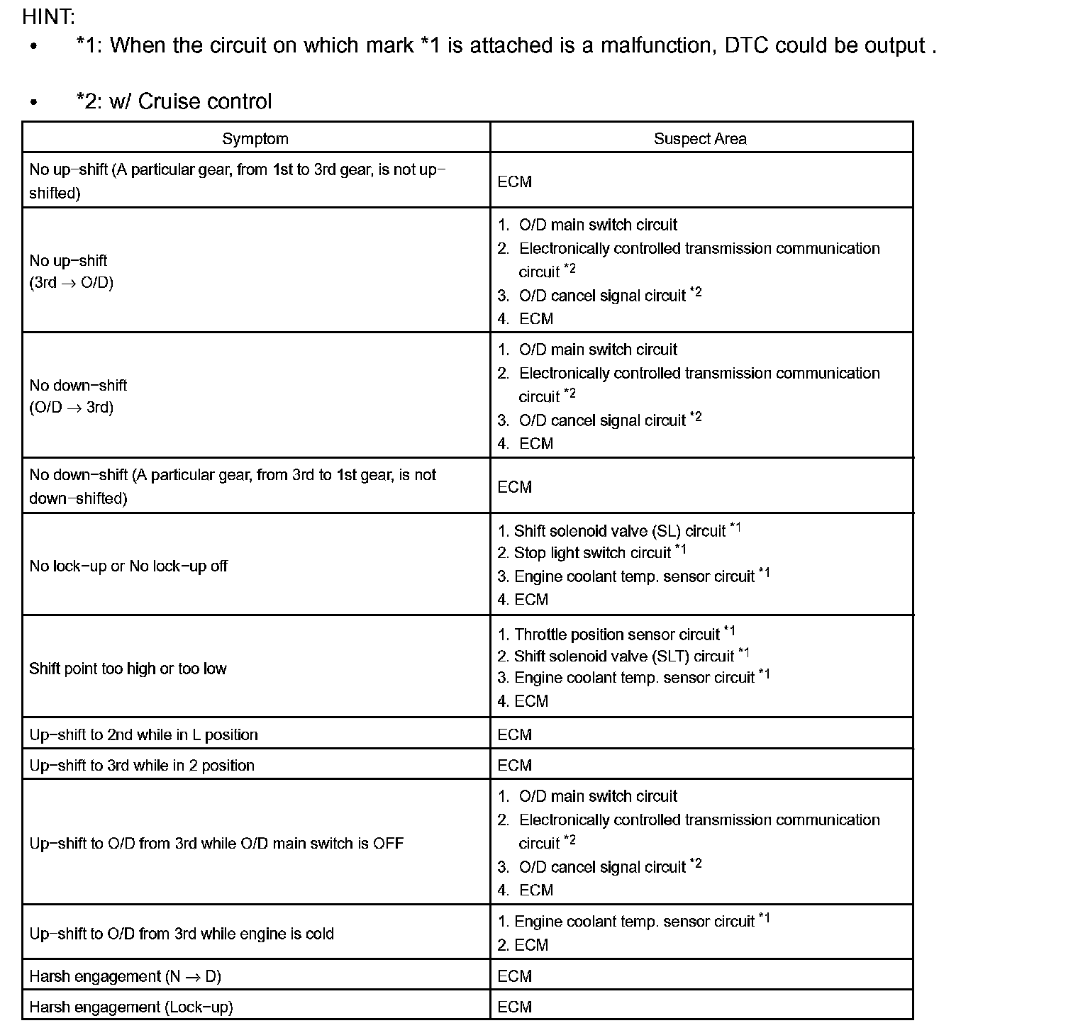 PROBLEM SYMPTOMS TABLEHINT: If a normal code is displayed during the diagnostic trouble code check although the trouble still occurs, check the electrical circuits for each symptom in the order given in the charts and proceed to the given troubleshooting.