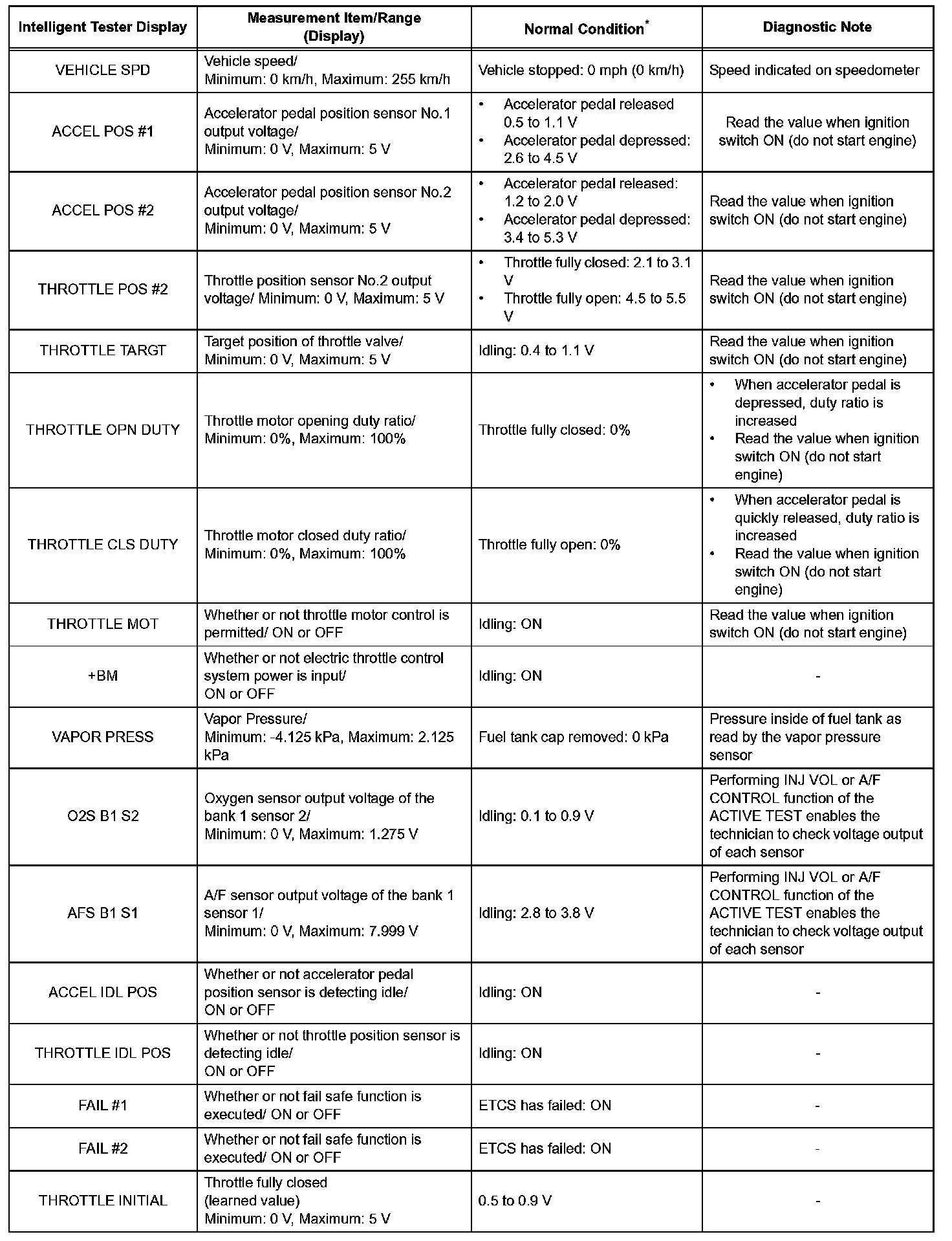 DATA LISTHINT: Using the intelligent tester's DATA LIST allows switch, sensor, actuator and other item values to be read without removing any parts. Reading the DATA LIST early in troubleshooting is one way to shorten labor time.