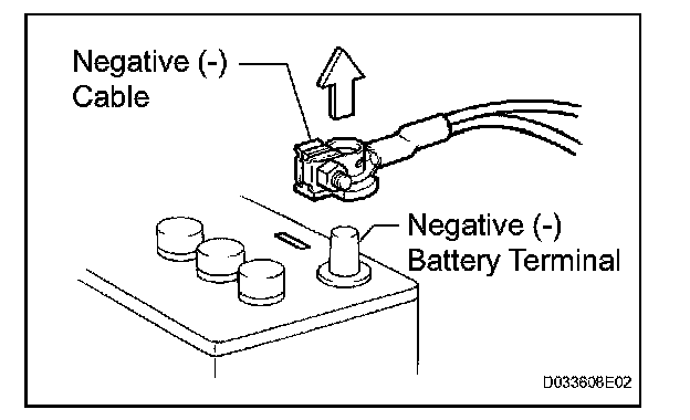 1. Before performing electronic work, disconnect the cable from the negative (-) battery terminal to prevent component and wire damage caused by accidental short circuits.