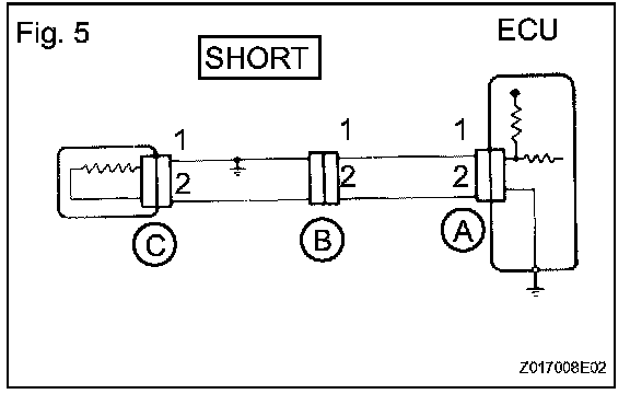 a. If the wire harness is ground shorted (Fig. 5), locate the section by conducting a resistance check with the body ground (given).