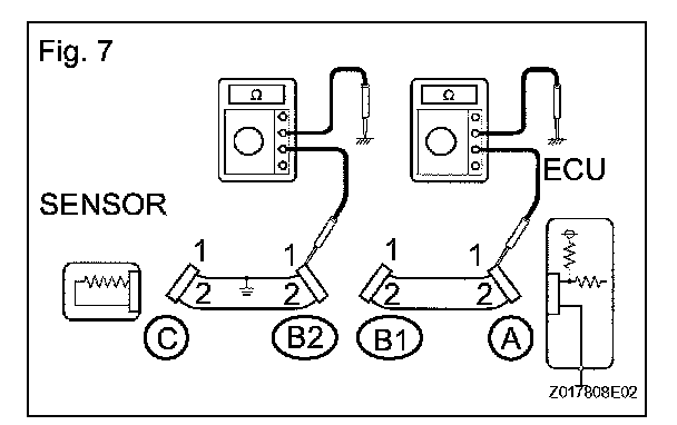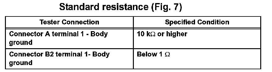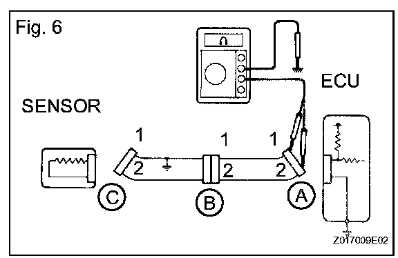 1. Disconnect connectors A and C and measure the resistance. Standard resistance (Fig. 6)