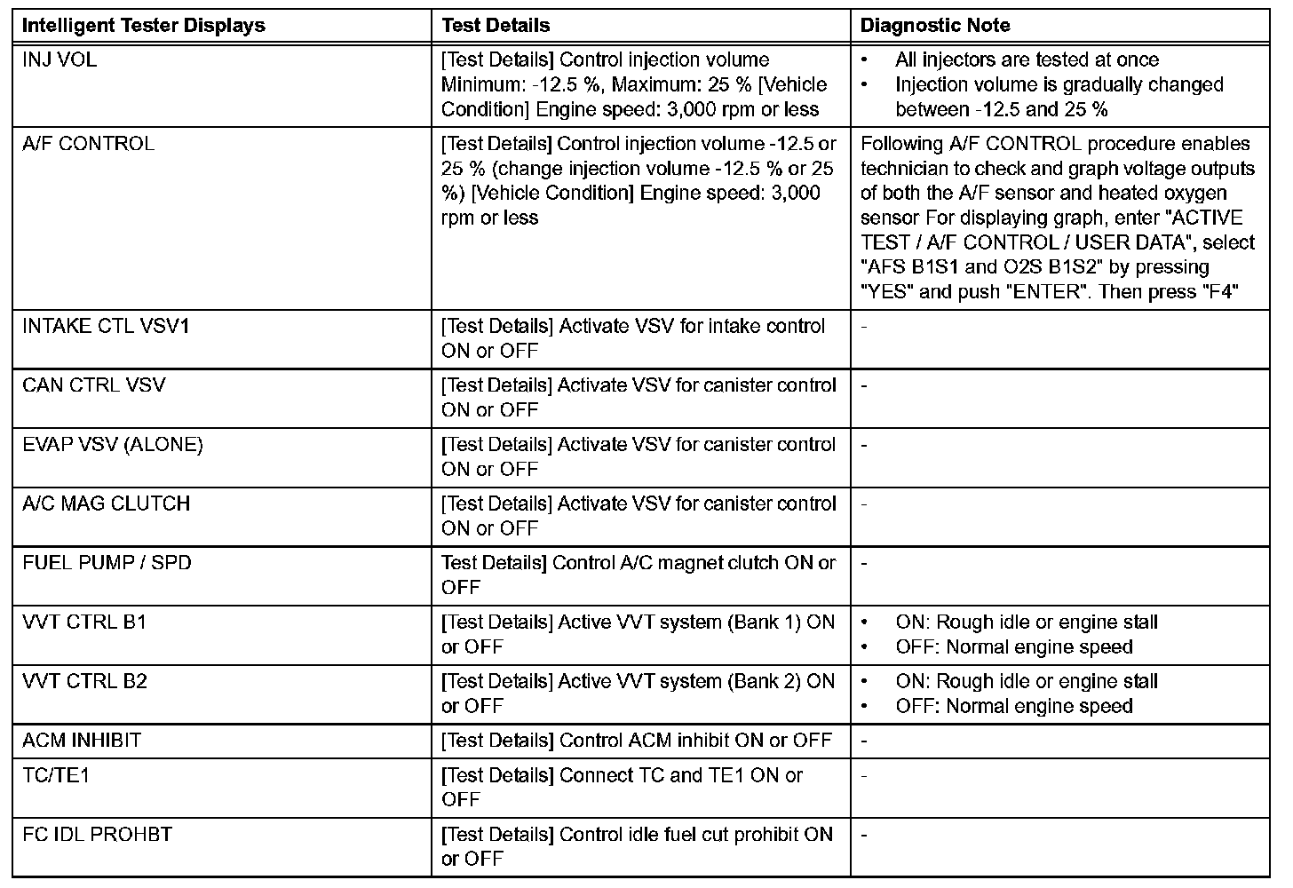 ACTIVE TESTHINT: Performing the intelligent tester's ACTIVE TEST allows relay, VSV, actuator and other items to be operated without removing any parts. Performing the ACTIVE TEST early in troubleshooting is one way to save time. The DATA LIST can be displayed during the ACTIVE TEST.