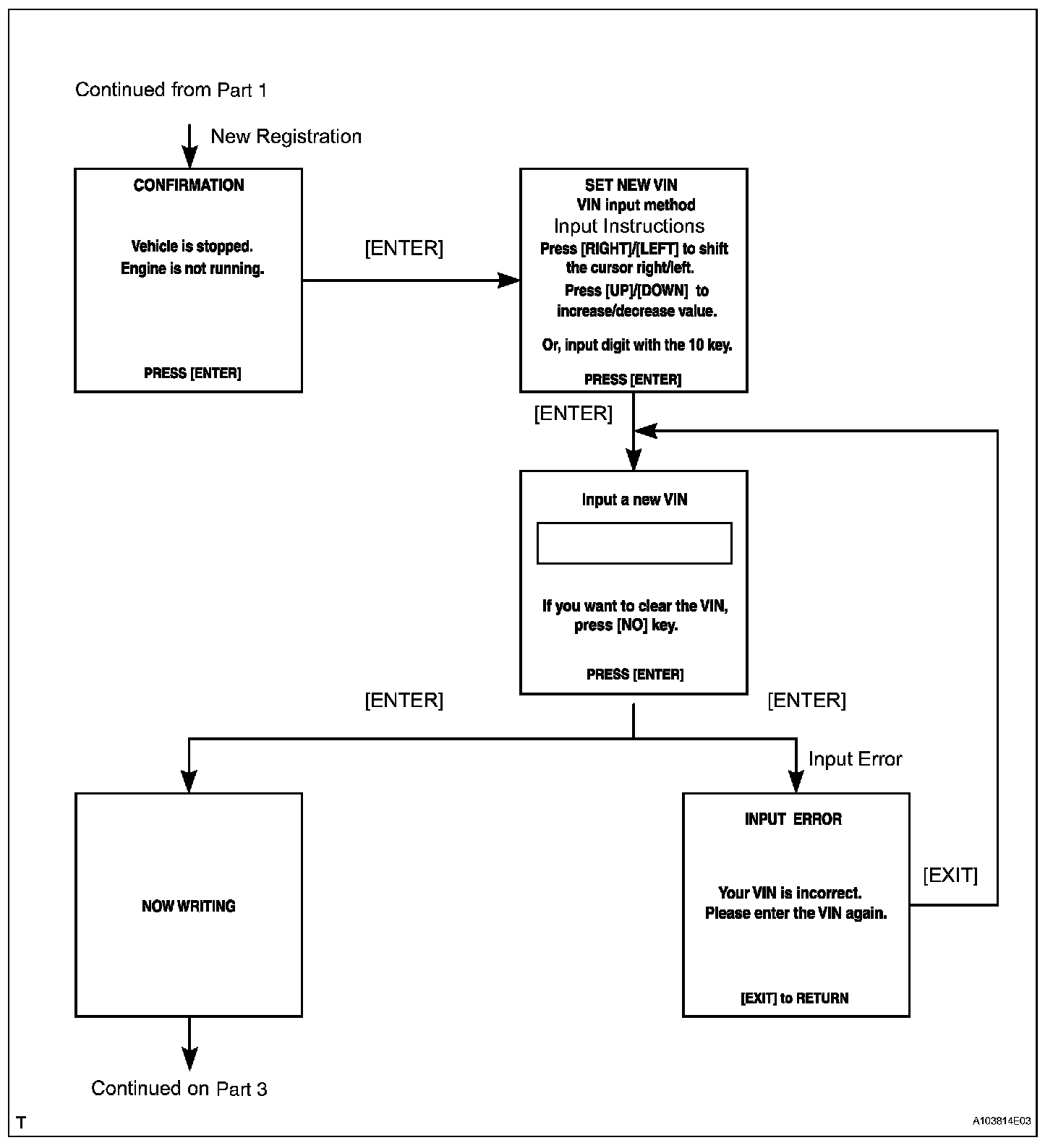 a. Explains the VIN writing process in a flowchart. This process allows the VIN to be input into the ECM. If the ECM is changed, or the ECM VIN and Vehicle VIN do not match, the VIN can be registered, or overwritten in the ECM by following this procedure.