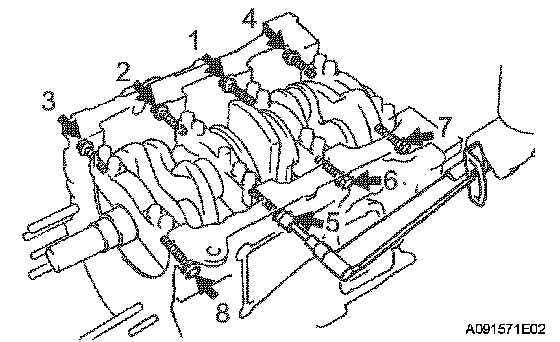 Uniformly install and tighten the 8 main bearing cap bolts in the sequence shown in the illustration.