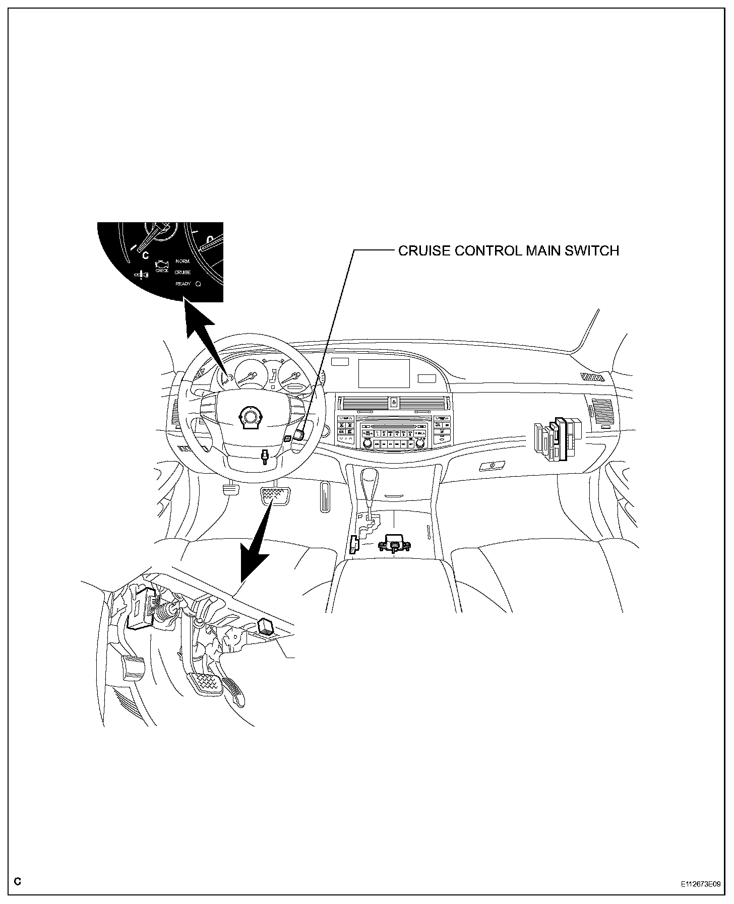 c. Pull out the cruise control main switch assembly in the direction shown by the arrow in the illustration.
