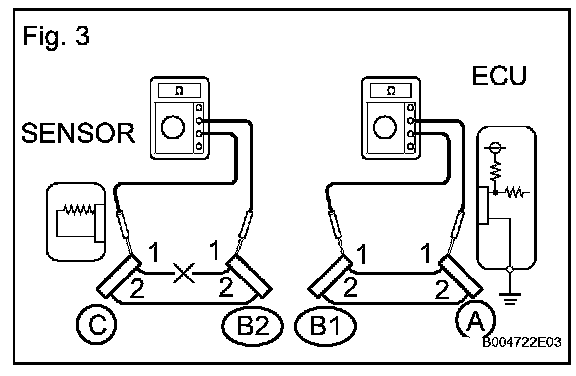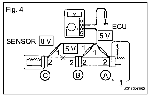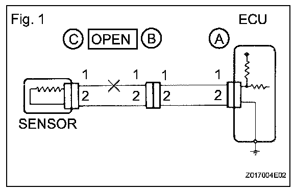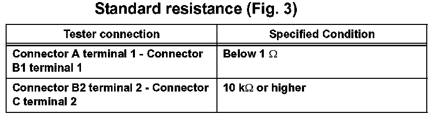 CHECK FOR OPEN CIRCUITa. For an open circuit in the wire harness in Fig. 1, the resistance or voltage, as described below.