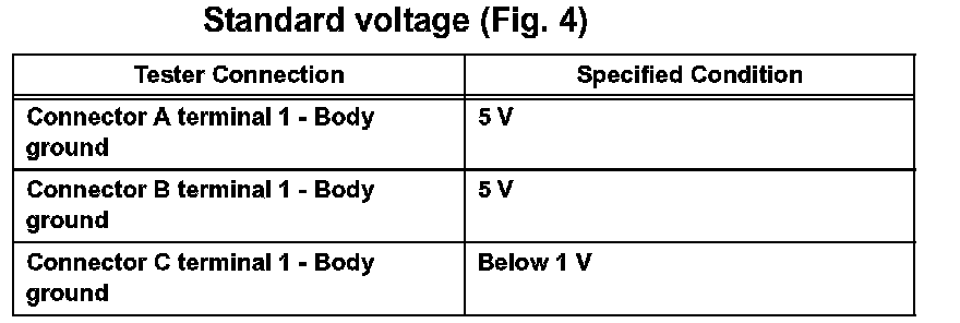 1. In a circuit in which voltage is applied to the ECU connector terminal, an open circuit can be checked by conducting a voltage check. With each connector still connected, measure the voltage between the body ground and these terminals (in this order): 1) terminal 1 of connector A, 2) terminal 1 of connector B, and 3) terminal 1 of connector C.
