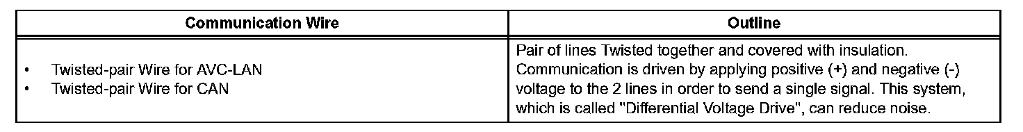 2. A single, Automobile Vinyl (AV) wire is used for BEAN communication. A twisted-pair wire is used for CAN and AVC-LAN communication.