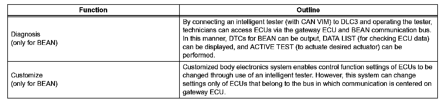 1. Protocols, which are rules for establishing data communication, differ between the CAN, BEAN and the AVC-LAN. If ECUs use different types of data such as communication speed, communication wire, and signals, they will be unable to communicate with each other.