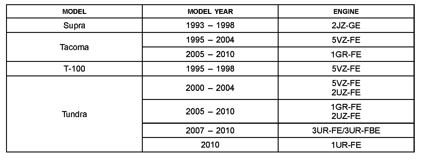 1AZ-FE, 2AZ-FE, 2AZ-FE (PZEV), 1GR-FE, 2GR-FE, 2JZ-GE, 1MZ-FE, 3MZ-FE, 1UR-FE, 3UR-FE, 2UZ-FE 5VZ-FE and 1ZZ-FE.
